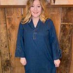 Look effortlessly chic in our Dark Wash Denim Dress! This versatile piece features a solid spread collar, half placket, and accented fixed bow for a touch of femininity. The adjustable waist tie and pockets add convenience and the lightweight, non-sheer material ensures comfort. Perfect for any occasion, this dress will be a staple in your wardrobe.