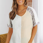 This Distressed Leopard Blouse is the perfect addition to any wardrobe. The white distressed color with patchwork leopard trim will give you a stunning and unique look. The professional look of this piece is sure to get you noticed.