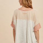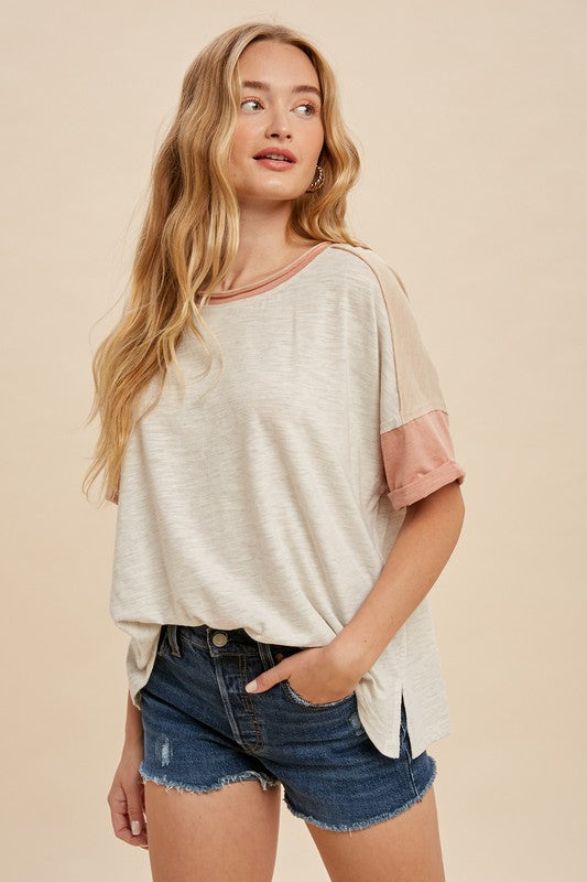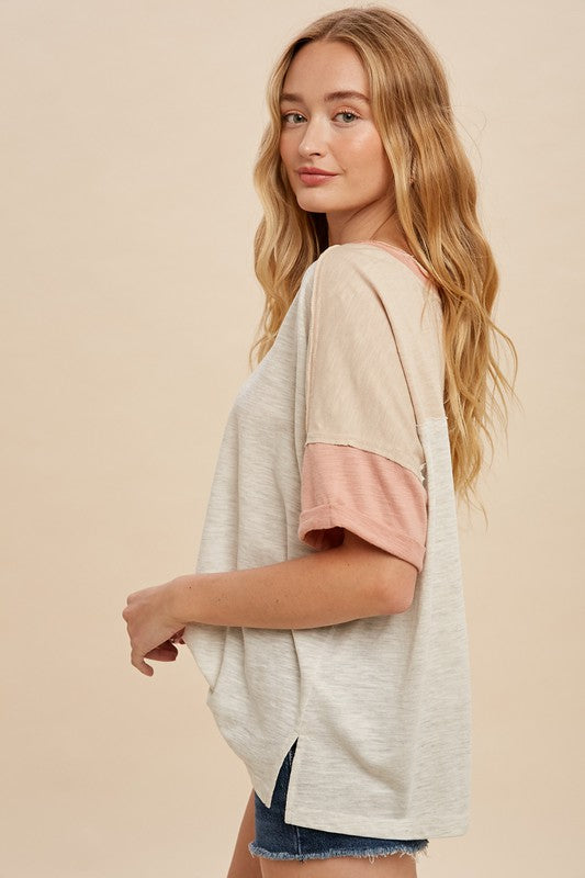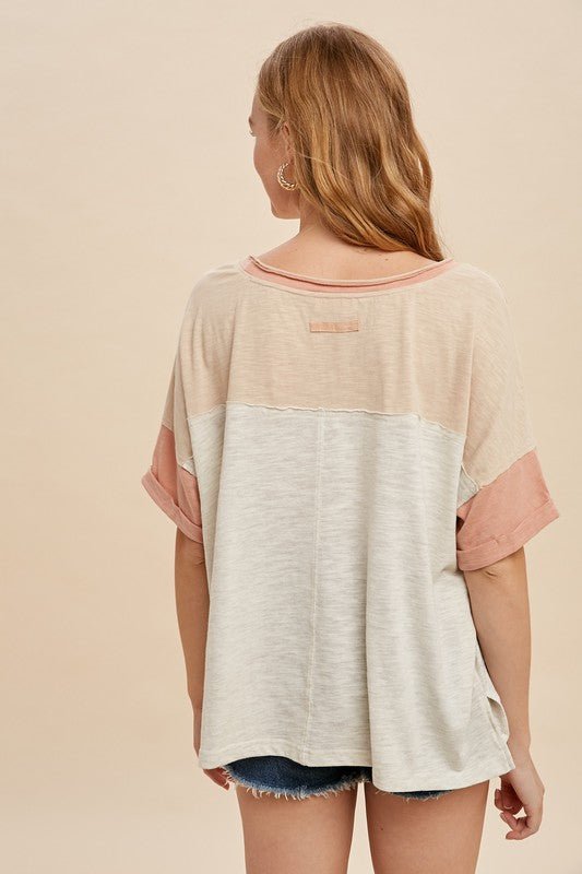 Experience superior comfort and style with the Easy Edge Tee. Crafted from 65% cotton and 35% polyester and garment-washed for extra softness, this color block tee boasts a rolled drop sleeve and split hem for a modern silhouette, while its raw edges add a unique touch. Available in a neutral peach combo color in sizes Small-Large.