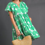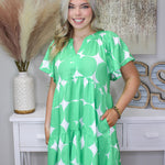 This Emerald Orchard Chic Dress is designed with sophisticated style. It features an apple green and white geometric V-neck with an empire-waist relaxed fit, offering feminine elegance. Perfect for any occasion, this chic dress will elevate your wardrobe with timeless sophistication.
