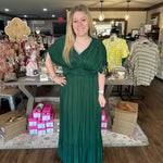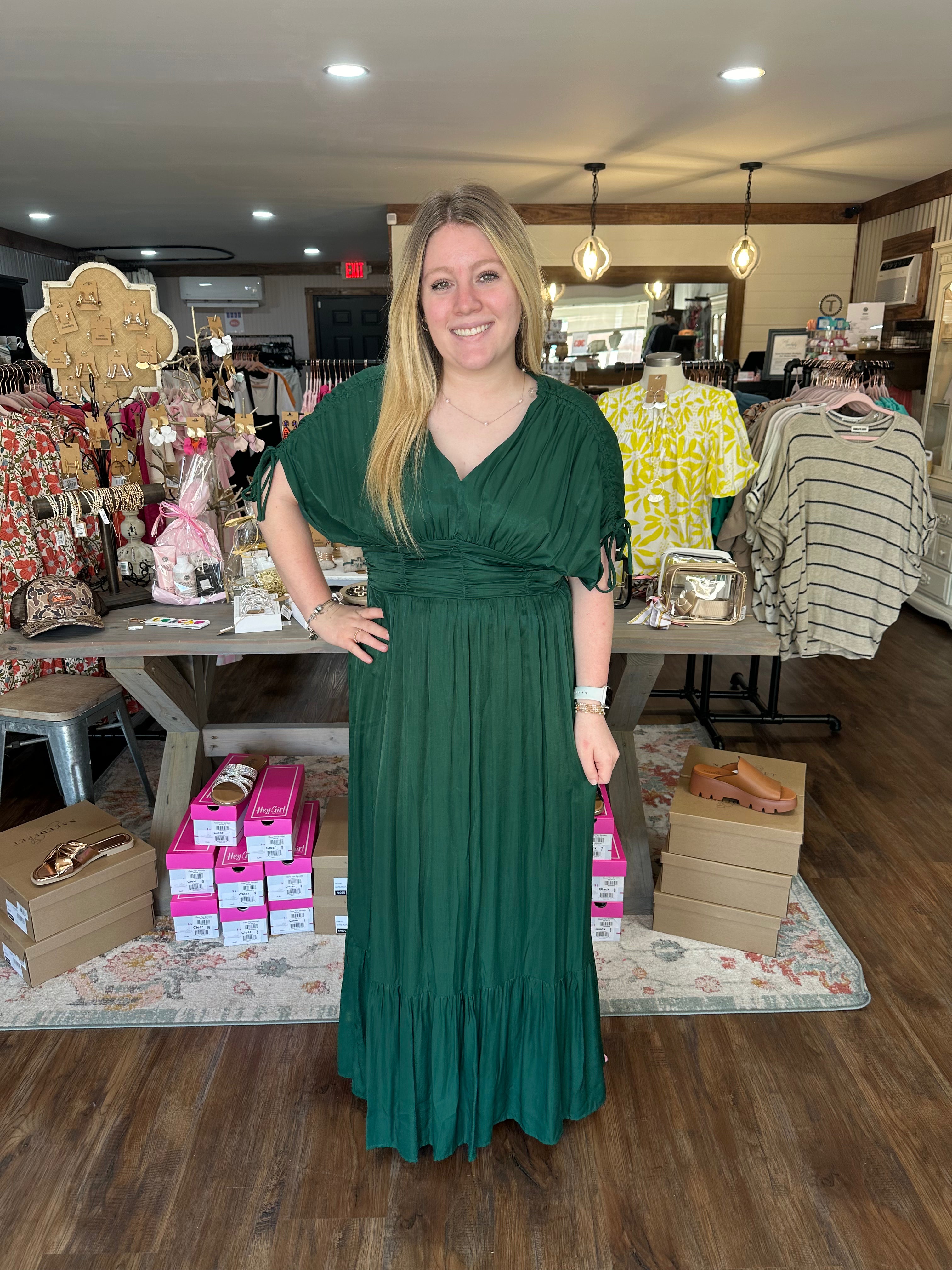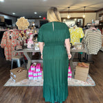 This gorgeous green satin maxi dress is all about elegance and style. It features a sleeveless design with a flattering V-neck and ruffled empire waist, creating a flowy and graceful silhouette. The back has a button closure, adding a delicate touch. It's fully lined, woven, non-sheer, and lightweight—perfect for any special occasion!