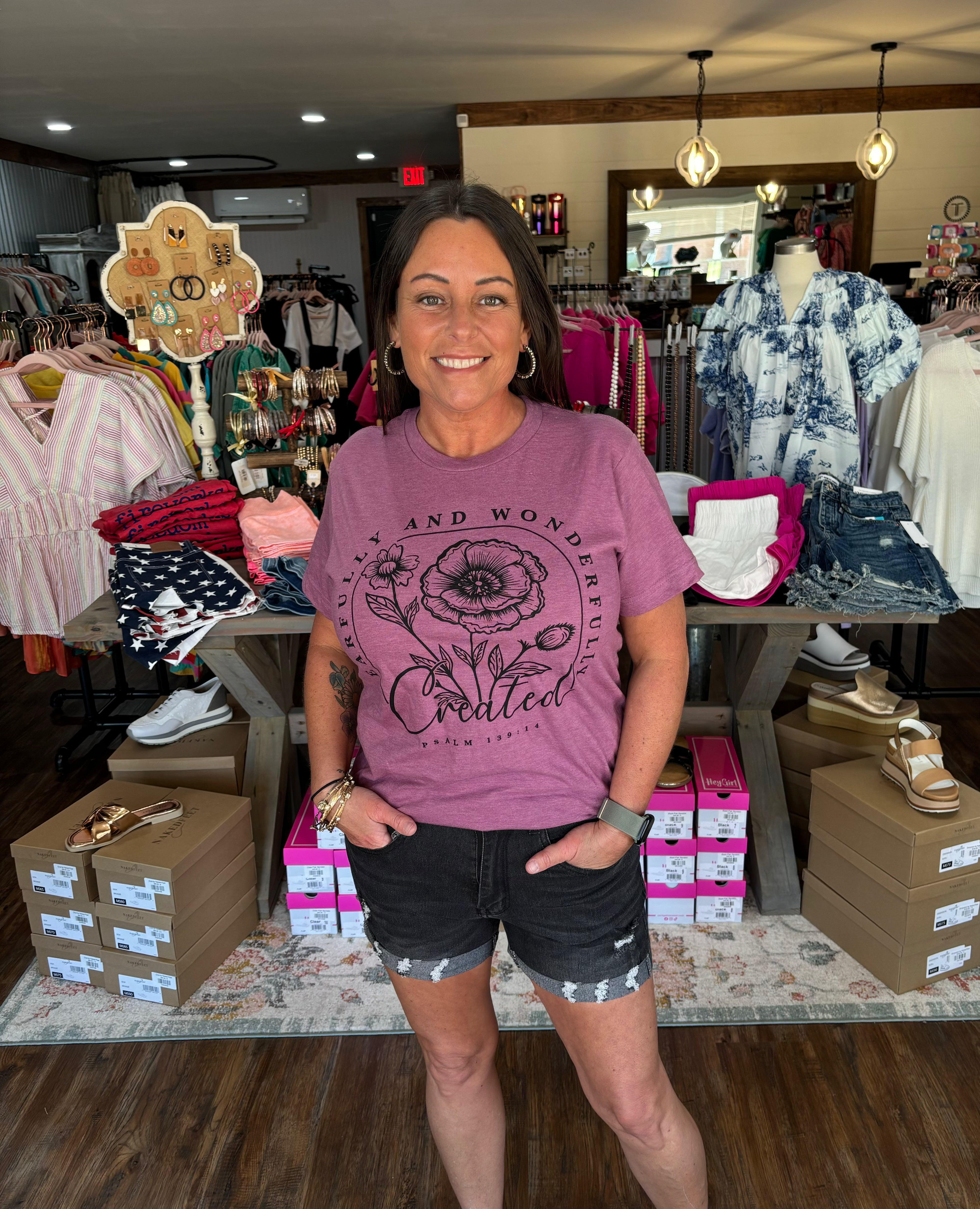 Embrace your uniqueness with our Fearfully and Wonderfully Made Tee! This gorgeous tee, available in sizes small-XL, will remind you of your beauty every time you wear it. The flowers are a beautiful touch to this already inspiring message. Size runs a tad oversized for ultimate comfort.