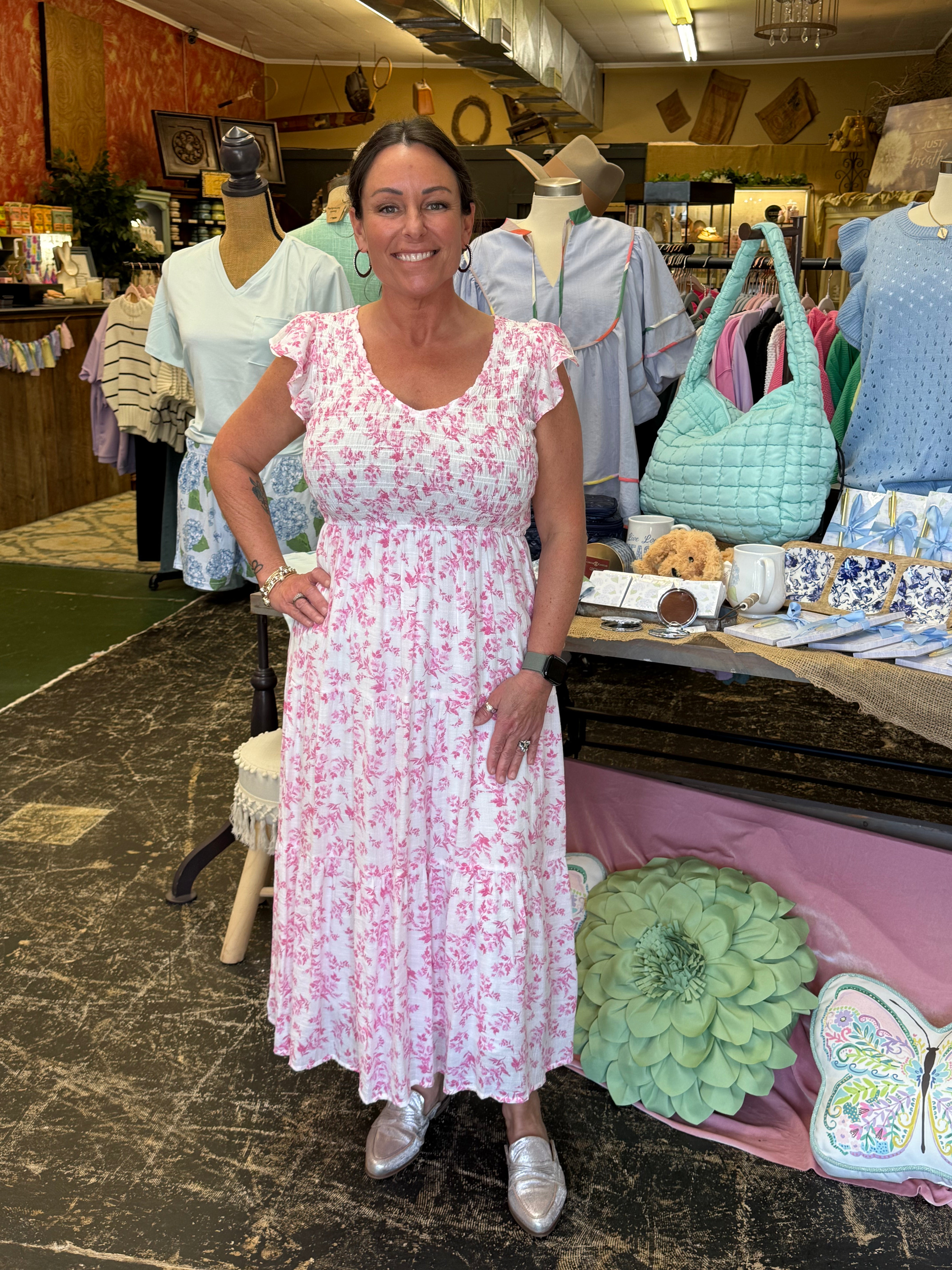 Elevate your style with our Floral V Neck Pink Dress! The V neckline and short ruffle sleeves add a touch of femininity, while the smocked A-line silhouette offers a comfortable fit. Lined with 100% polyester, this midi dress features a beautiful floral pattern - perfect for any occasion.