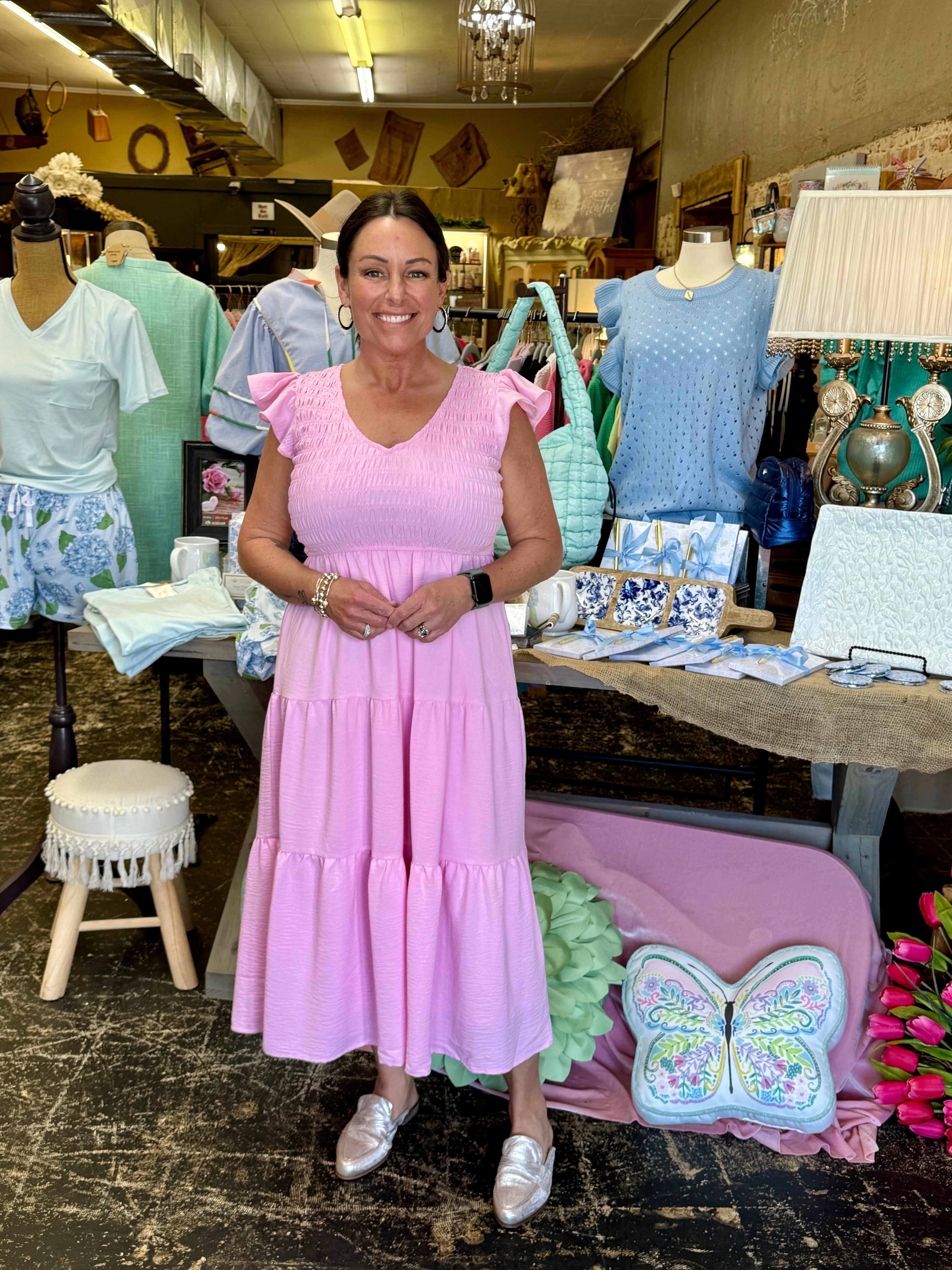 Effortlessly elegant, the Pink Flutter Sleeve Maxi Dress is perfect for any occasion. Its V-neckline and flutter sleeves add a touch of femininity, while the smocked bodice and tiered midi skirt provide a flattering silhouette. Made with 100% polyester and fully lined for maximum comfort.