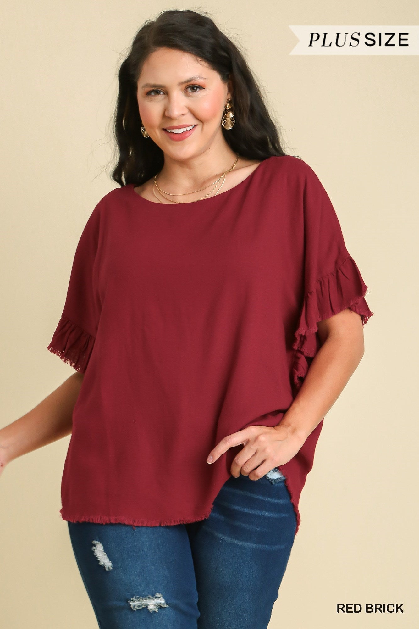 The Frayed Elegance Linen Blend Top offers a sophisticated yet relaxed look for every occasion. Designed with soft ruffle sleeves and a flattering round neckline, this plus-size top provides both comfort and style. The frayed scoop hem adds a playful, casual touch, while the breathable linen-blend fabric ensures all-day ease. Perfect for pairing with your favorite jeans or a chic skirt!