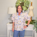 Feminine and full of charm, the Garden Party Ruffle Top is giving major spring energy! Featuring a soft coral pinstripe base with delicate floral prints, this pullover-style blouse is accented with sweet details like elbow-length puff sleeves, contrast trim, and a ruffled split neckline with tie detail. The shoulder ruffle adds just the right touch of playful drama.