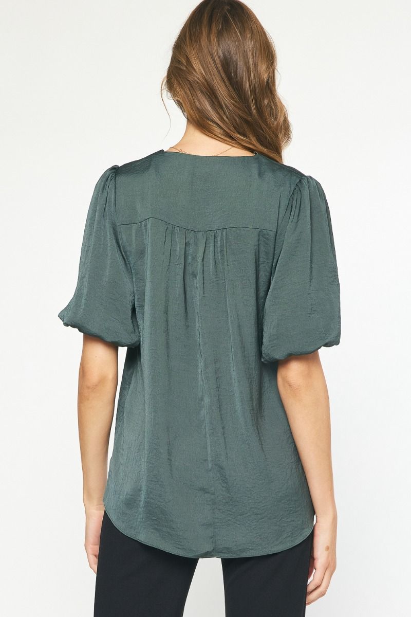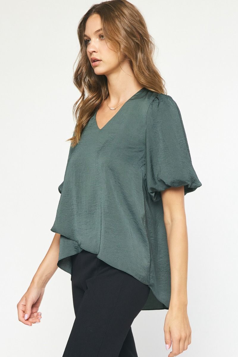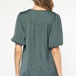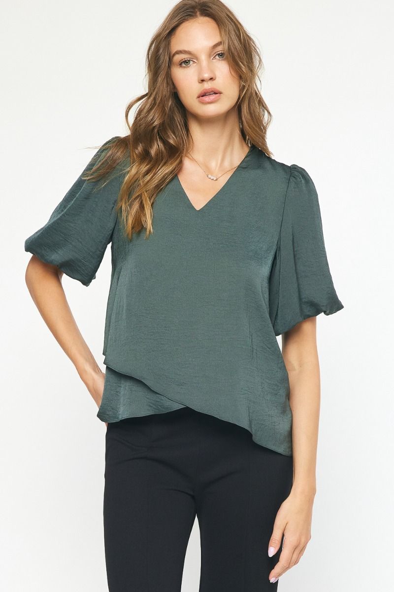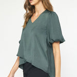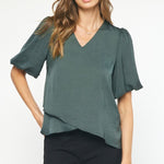 GracefulGlow is the perfect combination of beauty and comfort, featuring a solid V-neck short sleeve top made from lightweight woven fabric. The unique overlap detail at front hem and puff sleeves make this top both fashionable and functional. Unlined and non-sheer, this top is available in ash green.