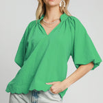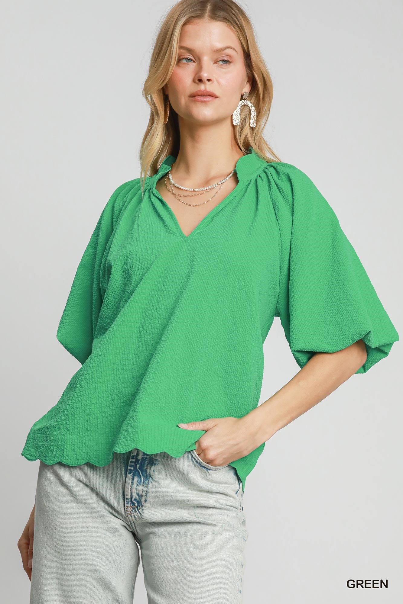 This Green Bubble Sleeve Seersucker Top features a unique scalloped hemline that adds a touch of playful elegance to your wardrobe. The lightweight fabric and bubble sleeves provide a comfortable and chic look, making this top perfect for both casual outings and special occasions. Upgrade your style with this must-have addition!