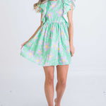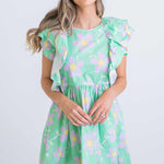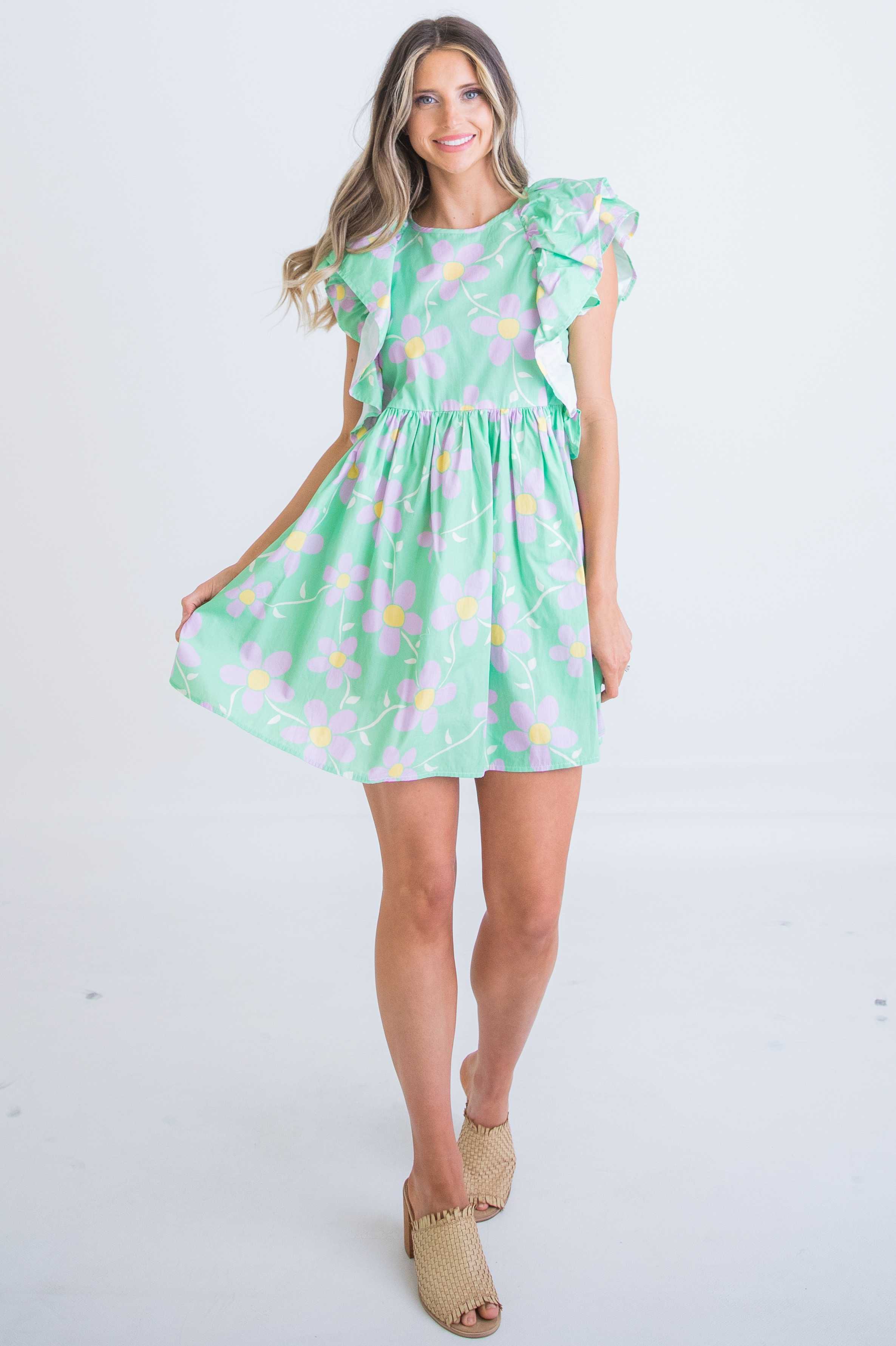 The Daisy Ruffle Poplin Dress by Karlie offers timeless sophistication with its lined design and ruffle sleeves. The vibrant daisy floral print will brighten any look, perfect for the summer or spring day. Available in sizes small-large.