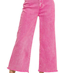 Unleash your inner fashion icon with our Hot Pink Acid Wash High Waisted Pants! These pants feature a stylish acid wash finish, frayed hem, and a flattering high waist. With good stretch and a unique color variation, each pair is one-of-a-kind. Elevate your wardrobe with a front rise of 11" and 25" inseam. Feel confident and stylish with a 22" leg opening.