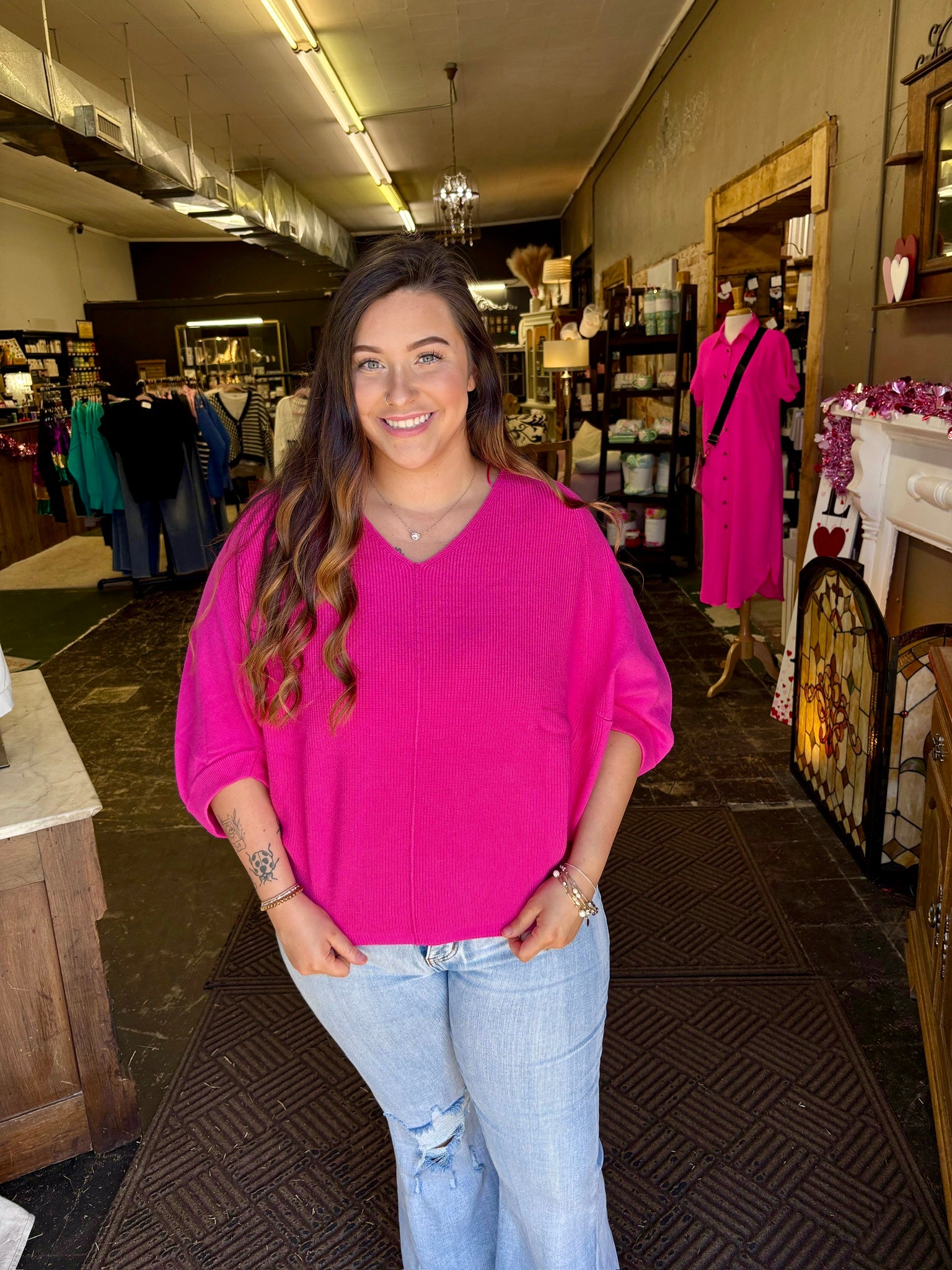 Bright, bold, and beautifully soft, this hot pink dolman sweater brings the perfect pop of color to your wardrobe. Featuring a flattering V-neck and relaxed dolman sleeves, it offers effortless style with a lightweight feel. The curved hem creates an easy, flattering silhouette you can dress up or down.