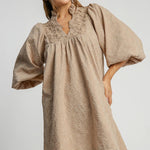 Indulge in luxury with our Jacquard Latte Dress. Featuring a beautiful floral jacquard design and elegant 3/4 puff sleeves, this dress will make you feel like royalty. The high neck and A-line silhouette add sophistication and style to any occasion. Elevate your wardrobe with this must-have piece.