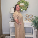 Understated elegance meets modern simplicity in this Latte Button Down Midi Dress. Designed with a structured silhouette, ruffled mock neck collar, and subtle puff sleeves, this piece brings timeless charm to your wardrobe. The crisp cotton feel and full button front make it both polished and easy to wear.