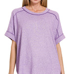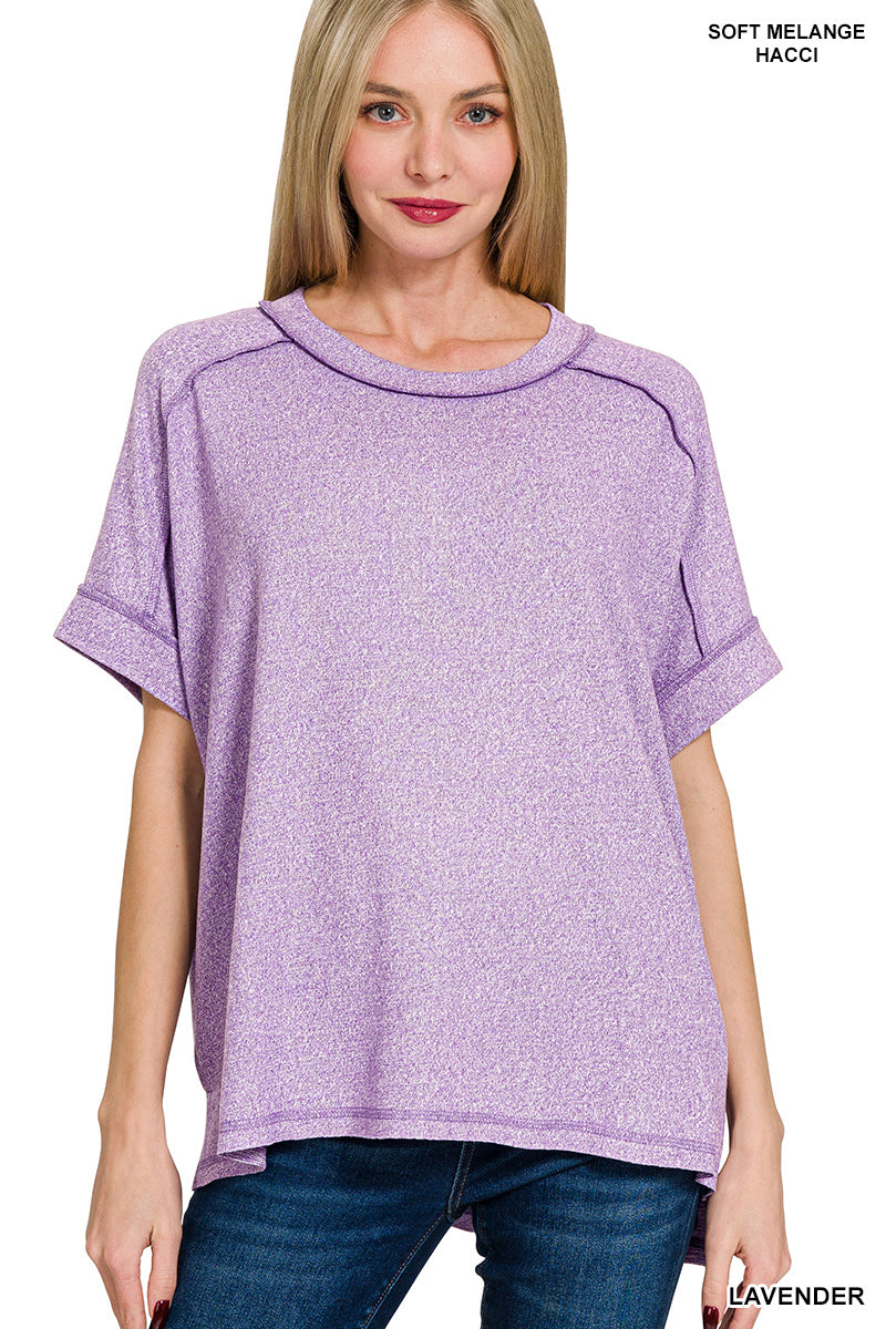 Experience ultimate comfort and style with our Lavender Melange Top! Made from soft melange fabric, it features a folded sleeve, hi-low hem with side slit, and exposed seam details for a trendy look. Elevate any outfit with this versatile and luxurious piece.