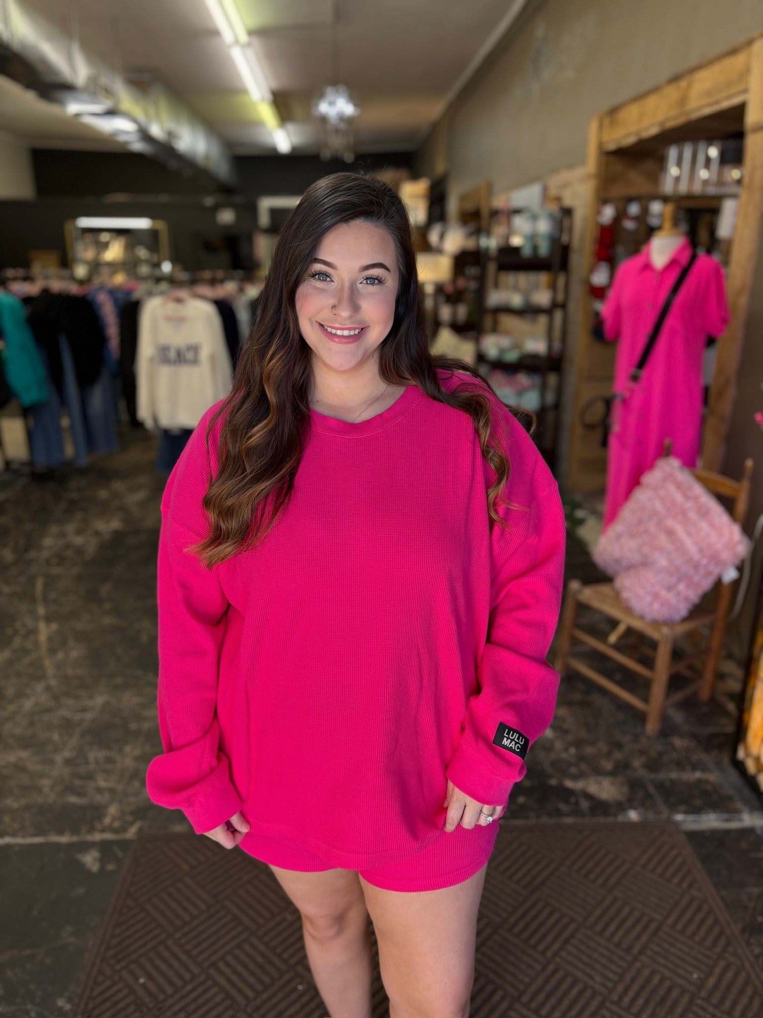 Bold, cozy, and oh-so-fun—the Lulu Mac Lounge Set in Hot Pink is a must-have for standout comfort. This two-piece set features a relaxed long sleeve top paired with matching shorts, all crafted from the same ultra-soft knit fabric you know and love from Lulu Mac.