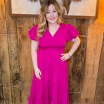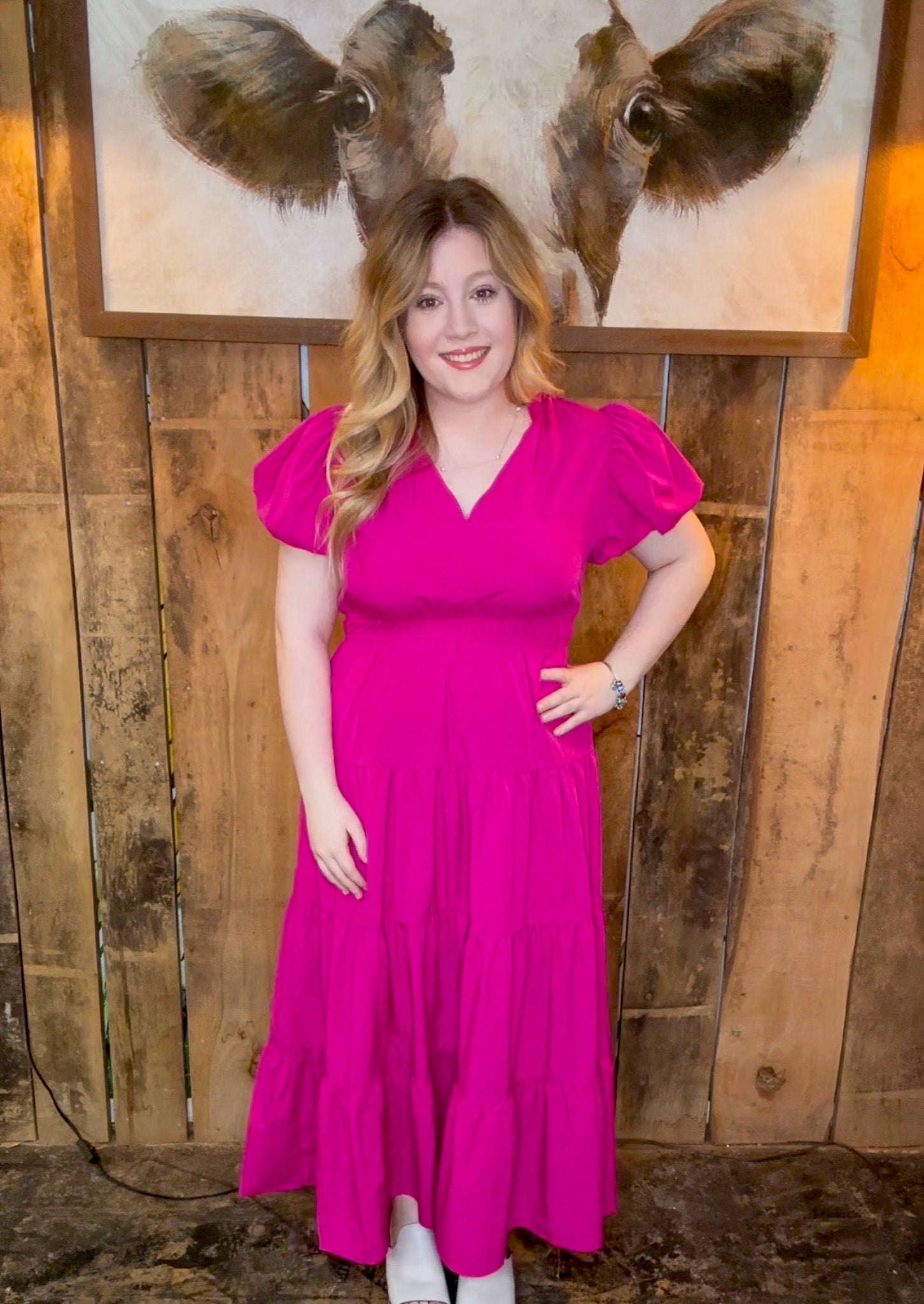 This vibrant magenta midi dress is a must-have for any wardrobe! The solid split v-neck and ruffled round neck add a touch of femininity, while the elastic waistband and lightweight material provide comfort and easy movement. Perfect for any occasion, this dress is both stylish and versatile.