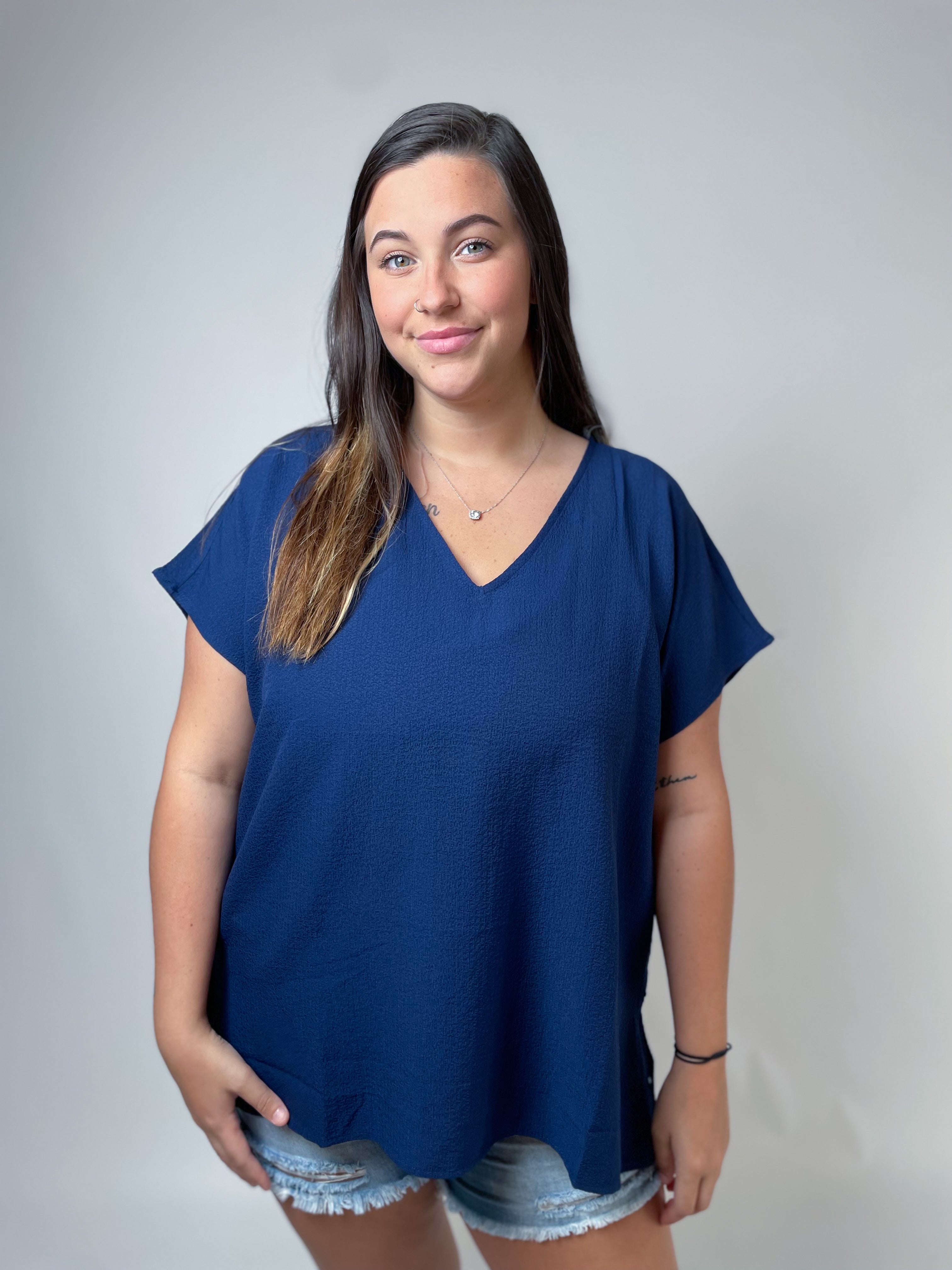 Stay stylish and comfortable with our Midnight Wave Top! This textured tunic features a flattering v-neckline and trendy dolman sleeves. Made of non-sheer fabric, it's perfect for any occasion. Available in sizes Small to 3XL. Get yours now and elevate your wardrobe!