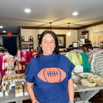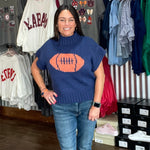 Experience the energy of the game with Navy Football Vibes! The FOOTBALL PATTERN is featured on a comfortable RIB BANDED SLEEVELESS SWEATER, perfect for showing off your love for the sport. Stay warm and stylish, while feeling the team spirit. Go team!!!
