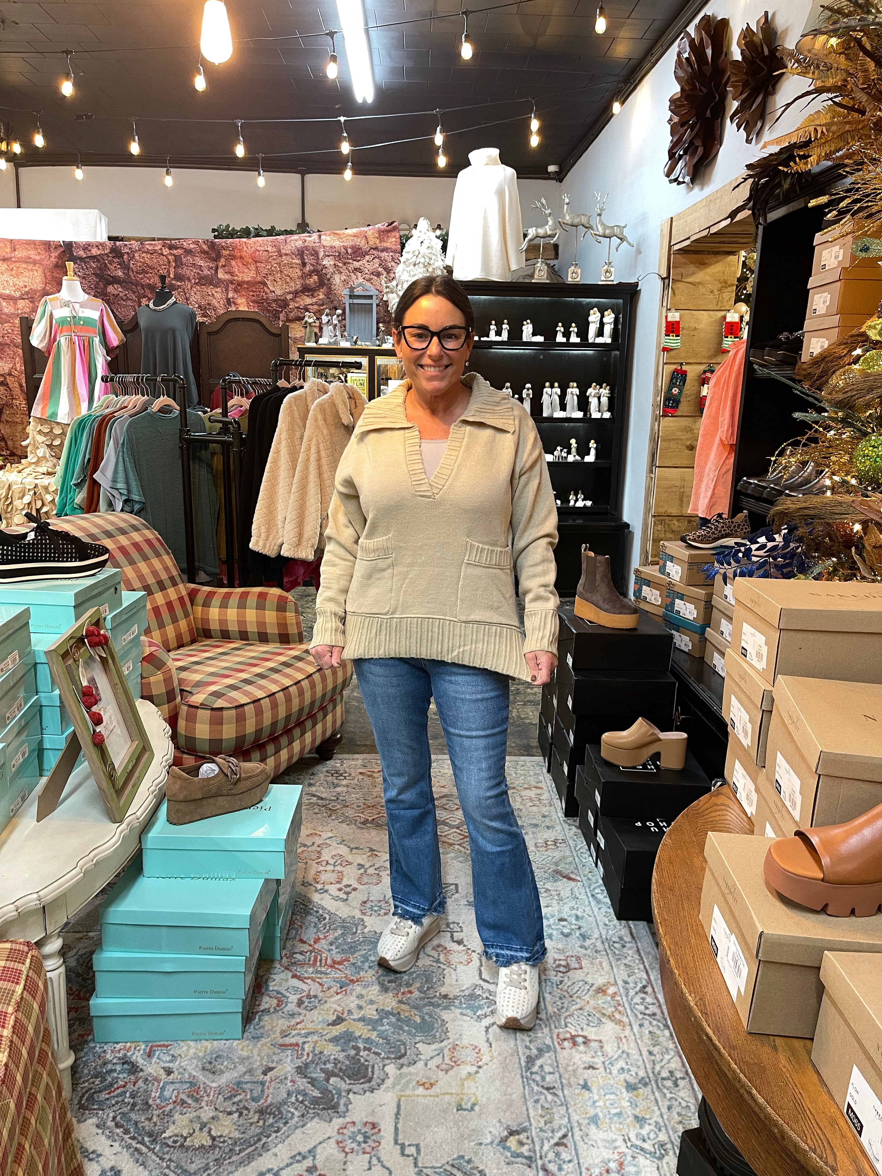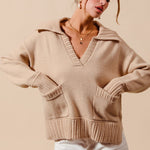 Wrap yourself in cozy comfort with our Oatmeal Flap Collar Sweater! This stylish knit crop pullover features a unique flap collar and convenient pouch pockets. Available in sizes Small to Large, it's the perfect addition to any wardrobe for both fashion and function.