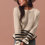 Stay warm and stylish with our Oatmeal and Black Sweater! This cozy sweater features a unique stripe pattern and open knit design that will make you stand out from the crowd. The ruffled edges add a touch of femininity to this must-have winter top. Upgrade your wardrobe with this versatile and chic piece.
