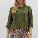 The perfect throw-on-and-go knit that still looks totally put together. This lightweight sweater features a gorgeous cable-knit texture, ¾ sleeves, and a relaxed fit for that effortless cool-girl vibe. Style it with jeans or a bold printed skirt—like leopard, of course.