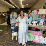 Women's V neck multi color and pattern tiered midi dress. Designed with flowy short sleeves and skirt slits. Beautiful pastel patch-work.