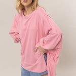 The Pink Comfort Terry Top is your go-to for effortless style and cozy comfort. Crafted from soft pink French terry, this top features a classic crew neck and trendy drop shoulders for a laid-back vibe. The long balloon sleeves with fitted split cuffs add a touch of drama, while the relaxed bodice ensures a comfortable fit. Designed with thoughtful details like side slits, reverse seam accents, and a chic high-low hem, this top effortlessly elevates your casual wardrobe. With its slightly oversized fit, available in sizes Small through Large, the Pink Comfort Terry Top pairs perfectly with jeans or leggings for a stylish, everyday look.