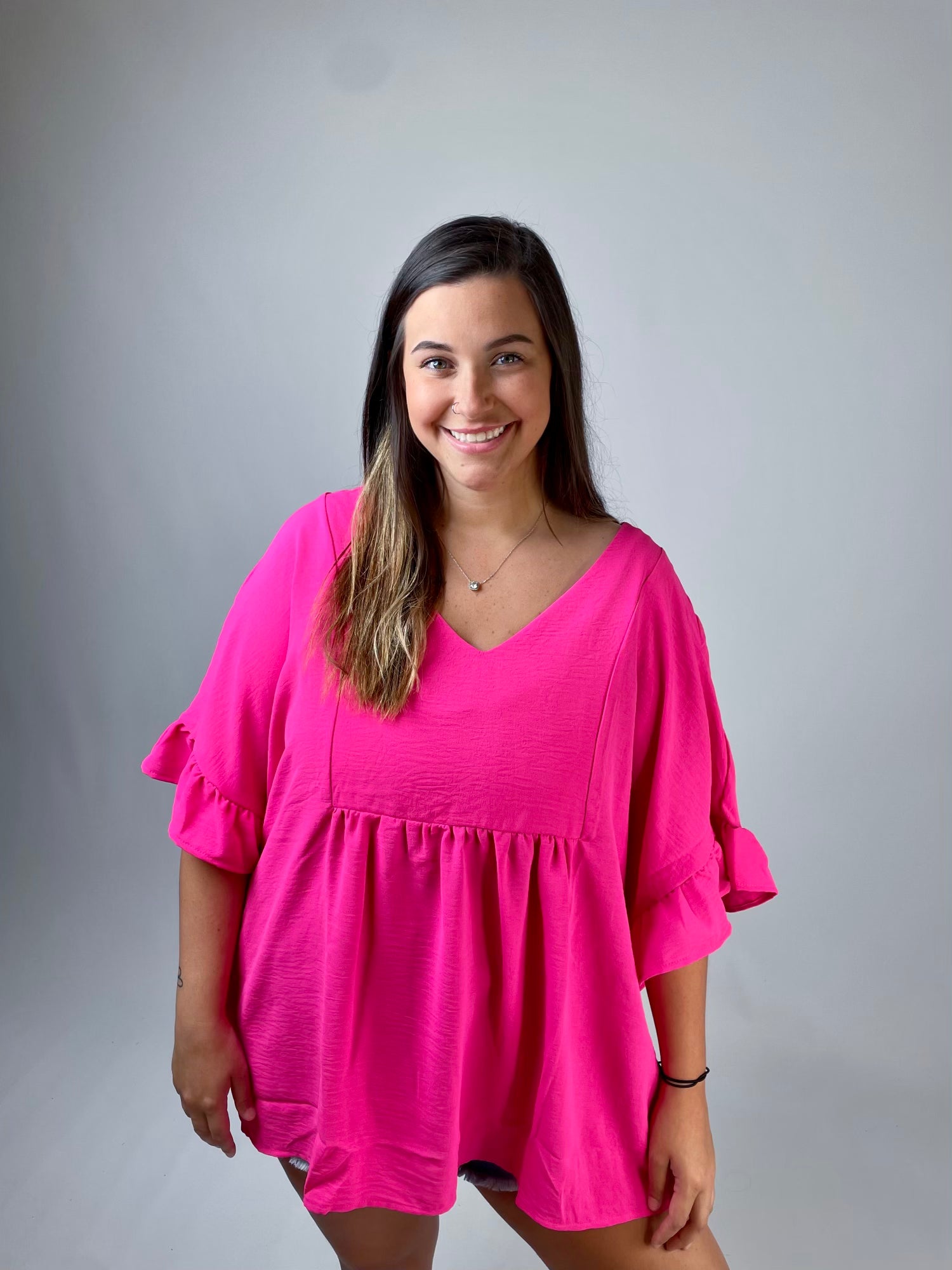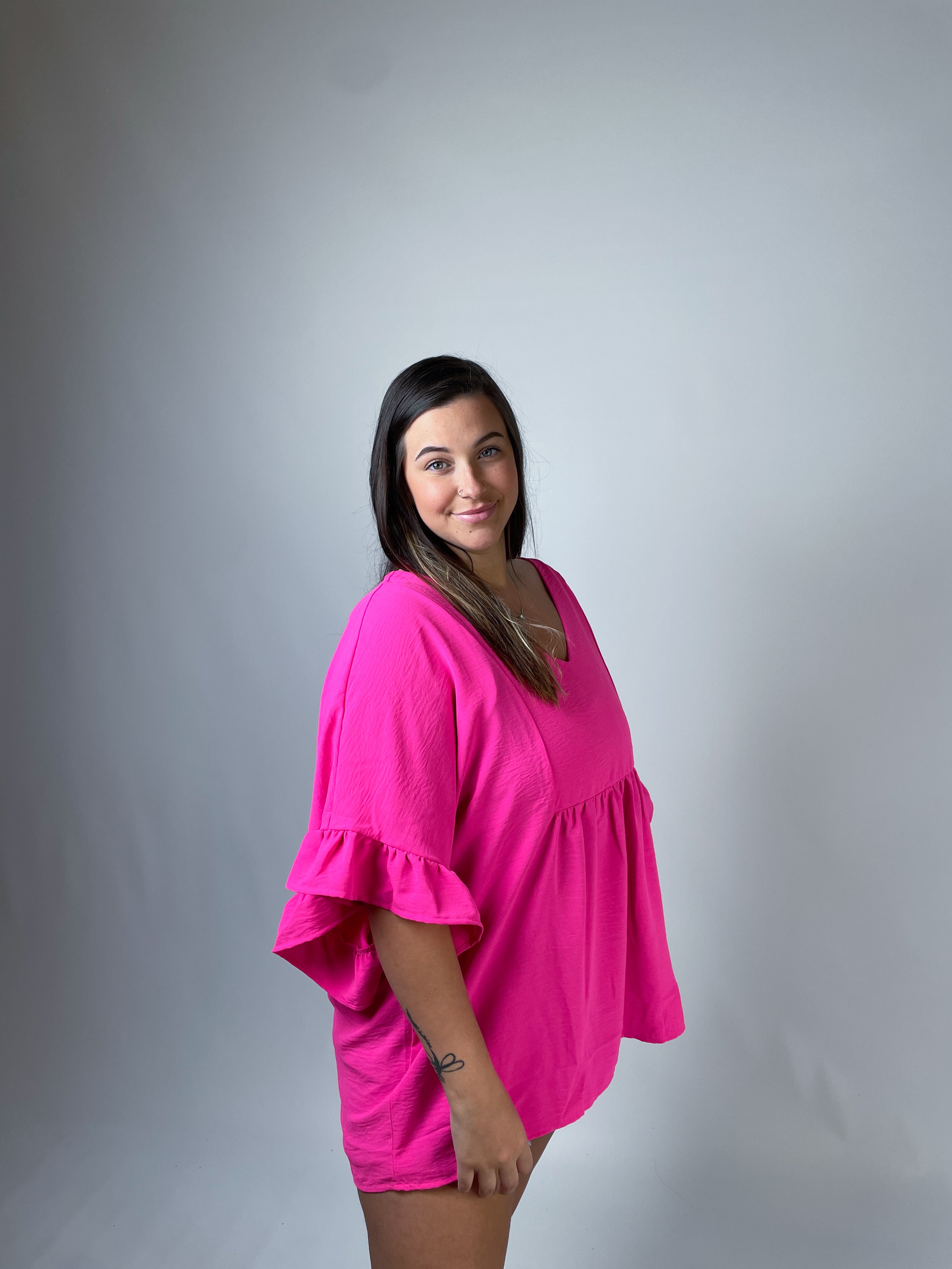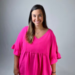 Get ready to turn heads in our Pink Dream Babydoll Top! This stunning barbie pink top features a flattering v-neckline and comfortable half sleeves. Plus, it's non-sheer for worry-free wear. Available in sizes 1XL-3XL, this top is perfect for adding a pop of color to any outfit. Trust us, you'll feel confident and stylish in this top!