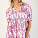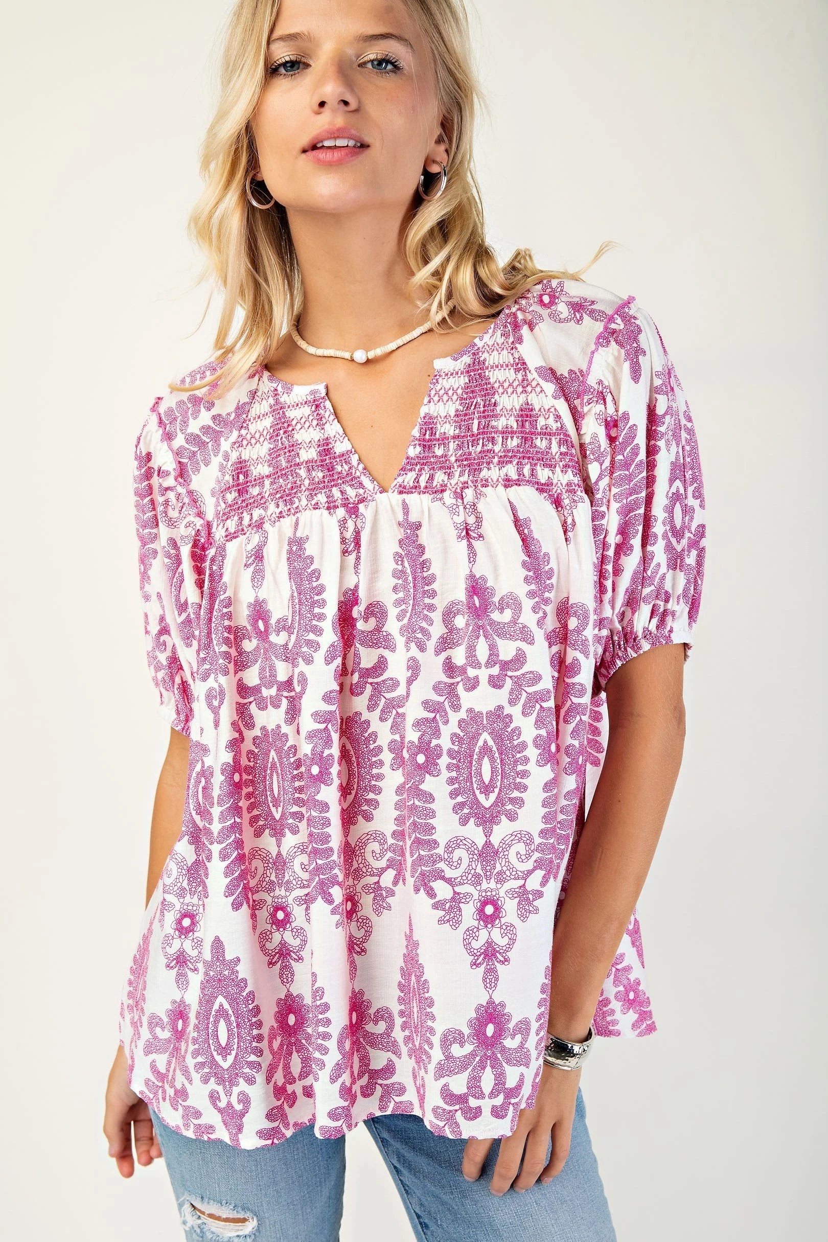Bright, breezy, and effortlessly stylish — our Dahlia Smocked Boho Top is the perfect pop of color for your warm-weather wardrobe! Featuring a vibrant pink embroidered print on lightweight white cotton, this top offers a relaxed fit with a flattering smocked bodice, puffed short sleeves, and a split V-neckline. It pairs beautifully with jeans, shorts, or white denim for a fresh and feminine look.