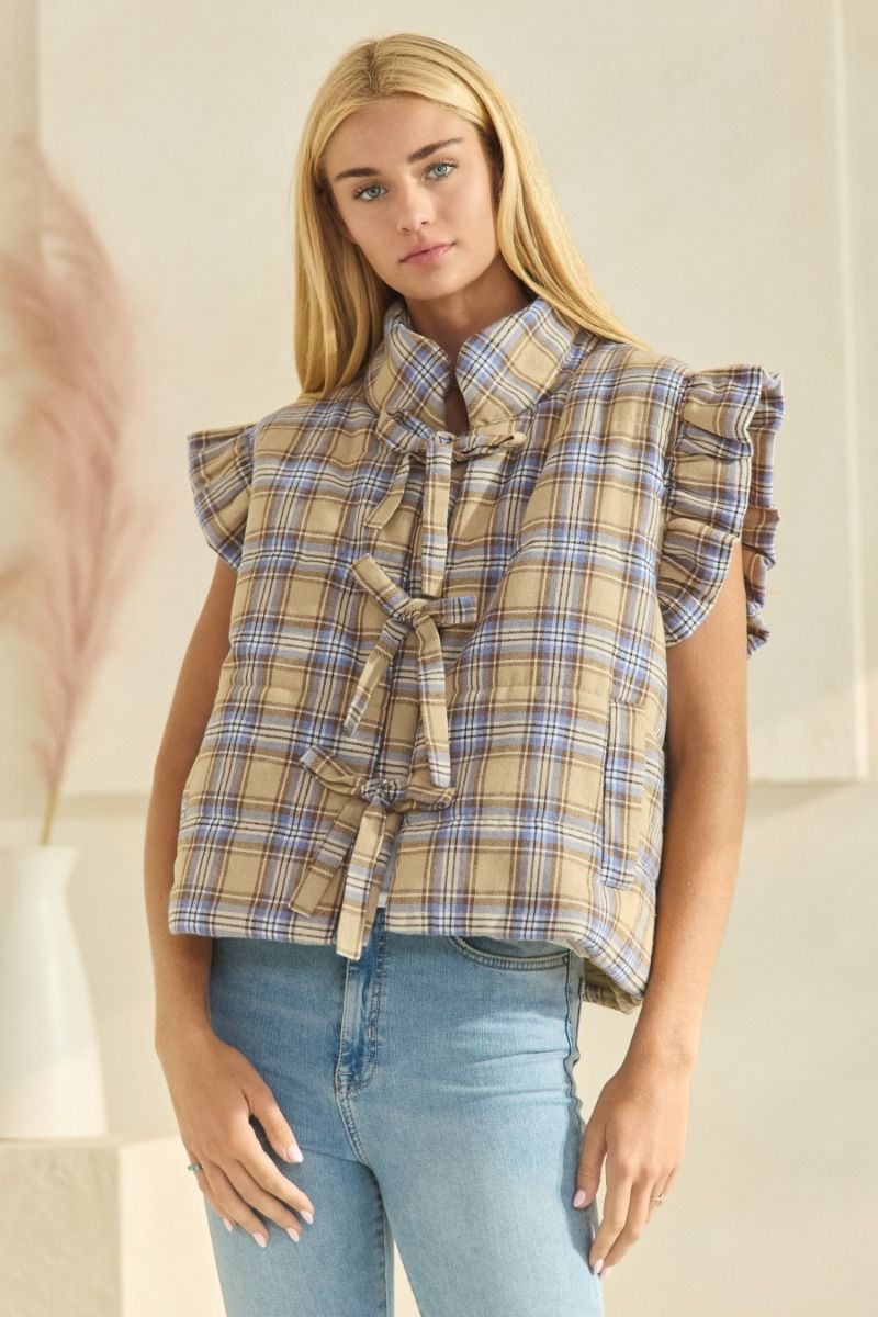 Plaid fabric front tie ribbon puffed vest with short ruffle sleeve.