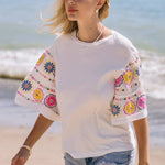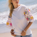Embroidered tiered ruffle elbow sleeve top featuring round neckline. 100% Cotton