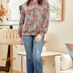 Fun printed hoodie for the transitional weather! We love the banded sleeve with hemline. Such a relaxed fit with stretchy material. Soft, lightweight, stretchy. Knit, non sheer.