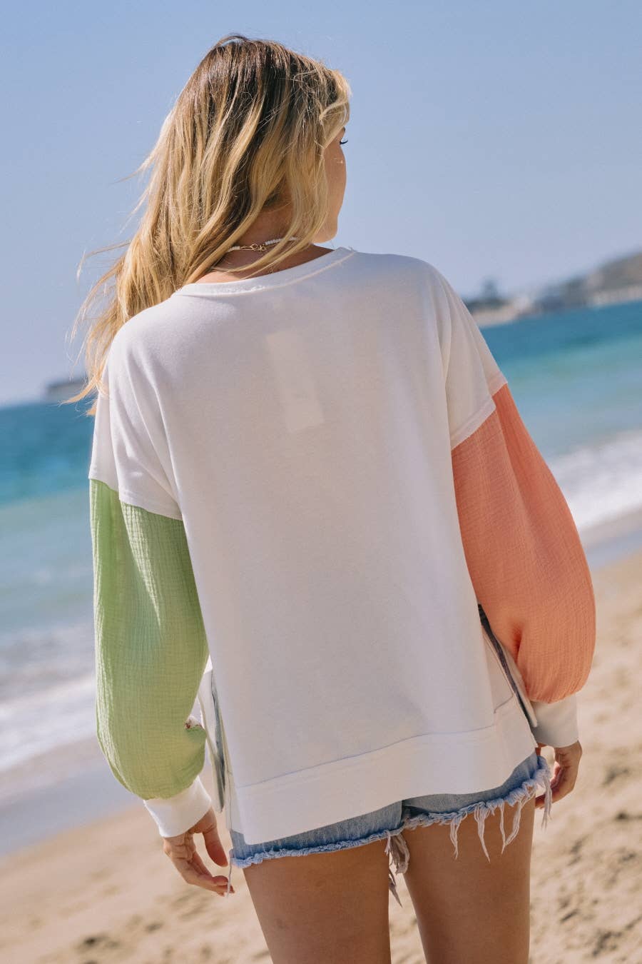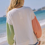 Oversized long sleeve french terry pull over featuring contrast sleeve with long side slit.