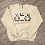 This Pumpkin Sweat Shirt is designed with comfort in mind! Crafted with a soft and cozy yet lightweight material, this shirt features a cute three pumpkin design. Perfect for a fall day!