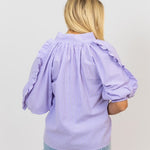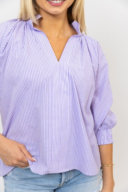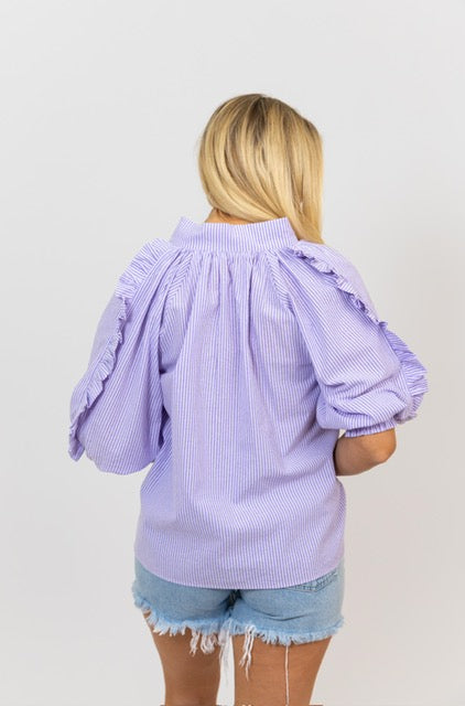 This stylish ruffle top by Karlie is perfect for any occasion. Its purple stripe, short sleeve design is available in sizes small-large, offering a flattering fit for every silhouette. Look your best with this timeless piece.