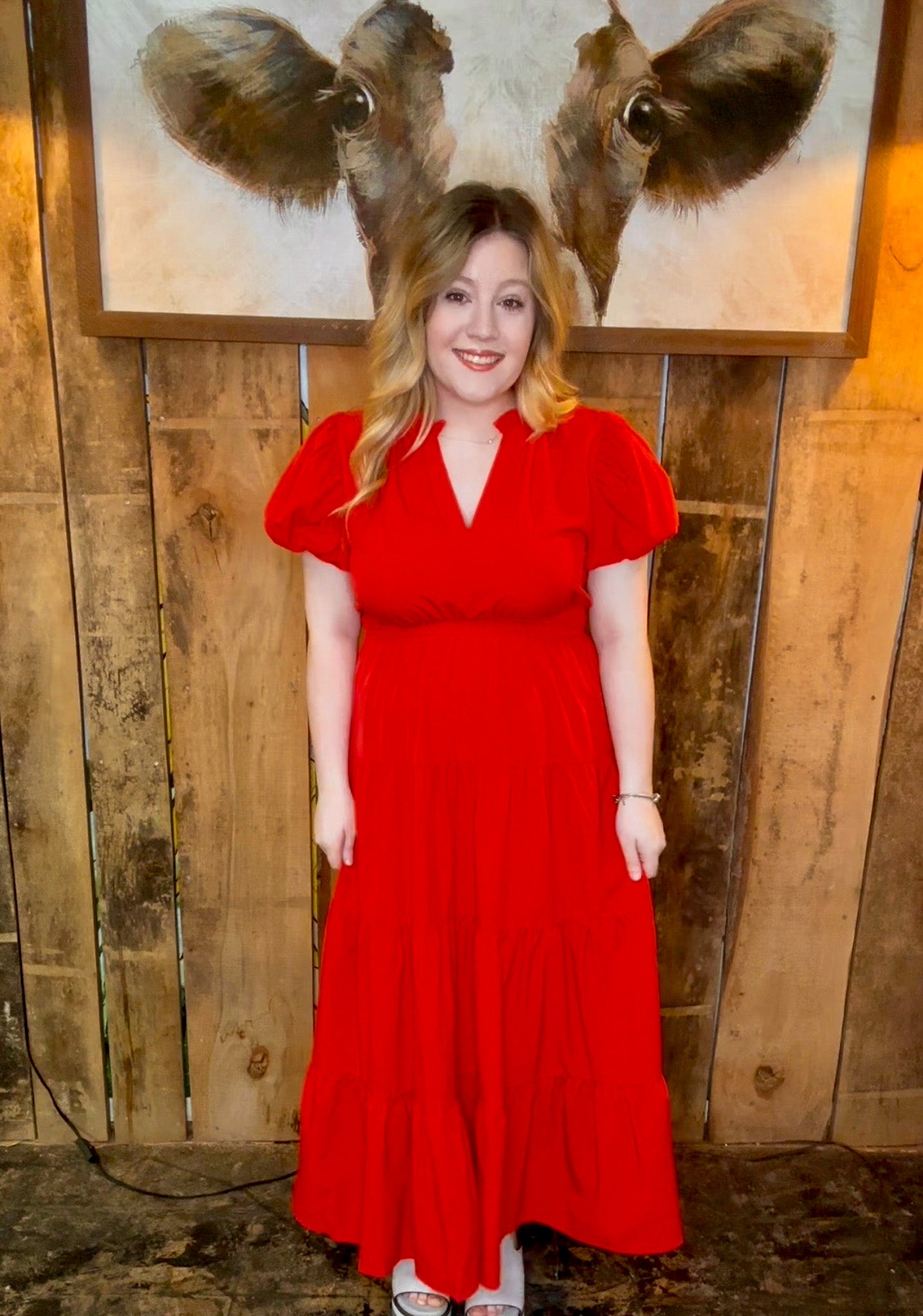 This vibrant red midi dress is a must-have for any wardrobe! The solid split v-neck and ruffled round neck add a touch of femininity, while the elastic waistband and lightweight material provide comfort and easy movement. Perfect for any occasion, this dress is both stylish and versatile.