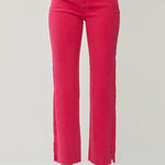 These bright fuchsia pants from Risen are a total must-have! The high rise and built-in tummy control panel give you a smooth, flattering fit that feels just as good as it looks. They’ve got a classic straight leg with a fun raw hem and side slit for a little extra style. Whether you’re heading out for dinner, running errands, or dressing up for girls’ night, these bold pink jeans will turn heads. Pair them with your favorite tee or a cute blouse and some heels—these pants do it all.