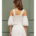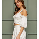 The Ruffled Fling makes a statement with its unique cold shoulder trim detail crop top coupled with a side ruffle skirt. Its striking combination of fashion and functionality are perfect for the beach and summer pictures. Available in white and sizes Small-Large.