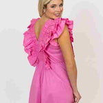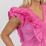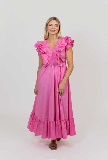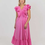 This Ruffled in Pink double Vneck Ruffle Maxi Dress by Karlie is perfect for any occasion. Featuring flattering and fun ruffle details as well as a comfortable lining, this dress brings style and elegance to any wardrobe in sizes small to large. The bright color helps to complete the look.