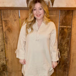 Look effortlessly chic in our Sand Wash Denim Dress! This versatile piece features a solid spread collar, half placket, and accented fixed bow for a touch of femininity. The adjustable waist tie and pockets add convenience and the lightweight, non-sheer material ensures comfort. Perfect for any occasion, this dress will be a staple in your wardrobe.