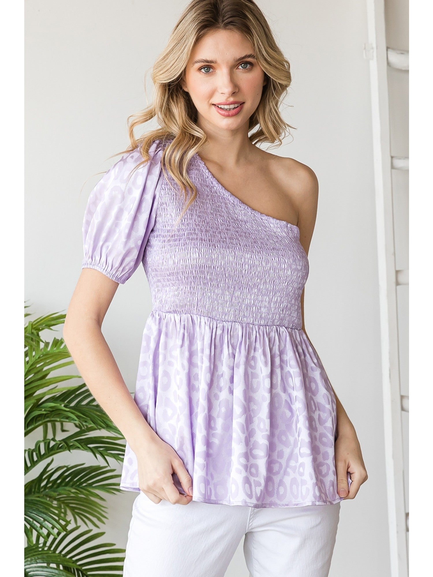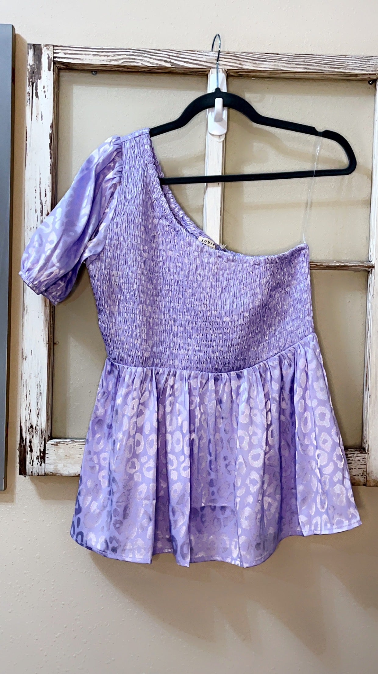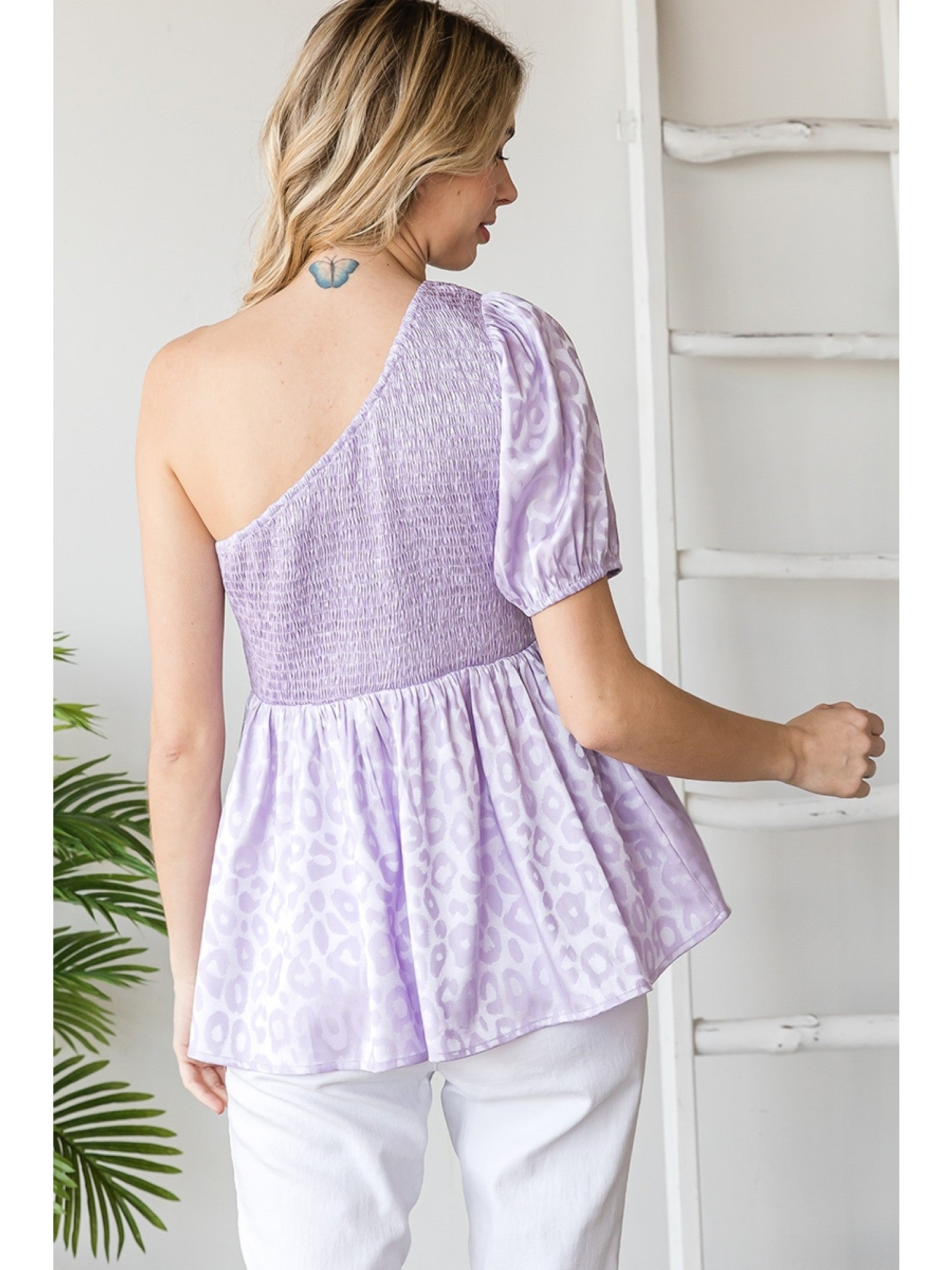Get ready to unleash your wild side with our Purple Passion Top! This satin leopard print baby doll top is perfect for any occasion, from girls' night out to a first date. Featuring one bubble sleeve and a smocked bodice, this asymmetrical top will make you feel confident and fierce. And don't worry about any see-through mishaps - it's unlined, non-sheer, and lightweight. Shop now and own your style with us!