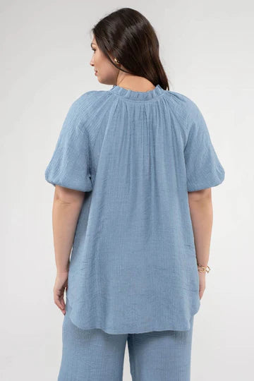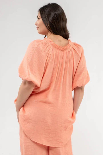 This blouse features a unique, scrunched v-neck that adds a touch of elegance to your wardrobe. The elastic sleeves create a comfortable fit, while the unlined design keeps you cool and stylish. Available in sizes 1XL-3XL in light teal and dusty peach. Made with 64% rayon and 36% polyester.
