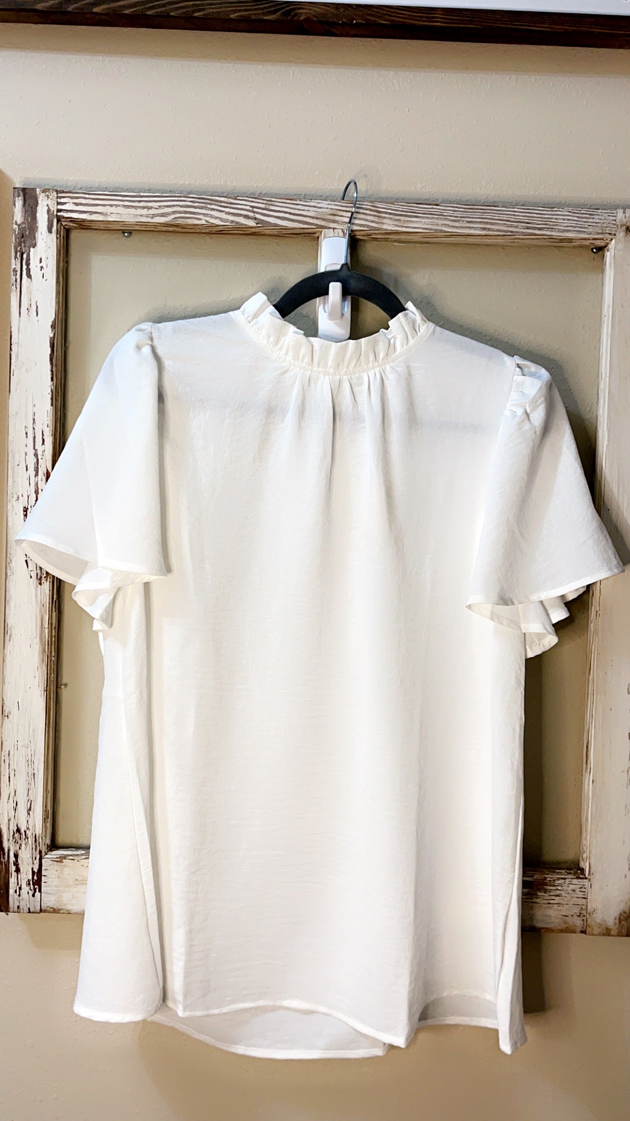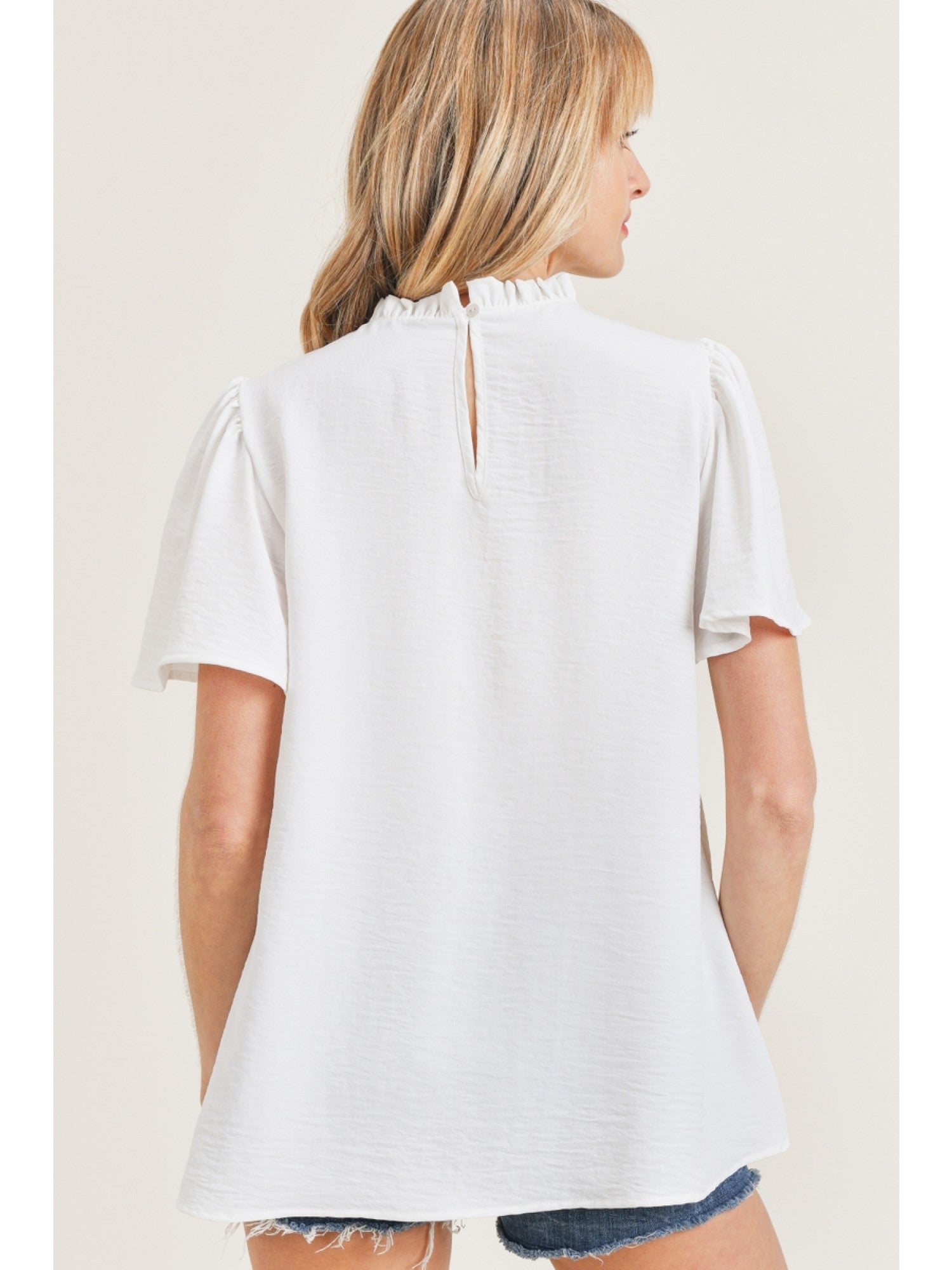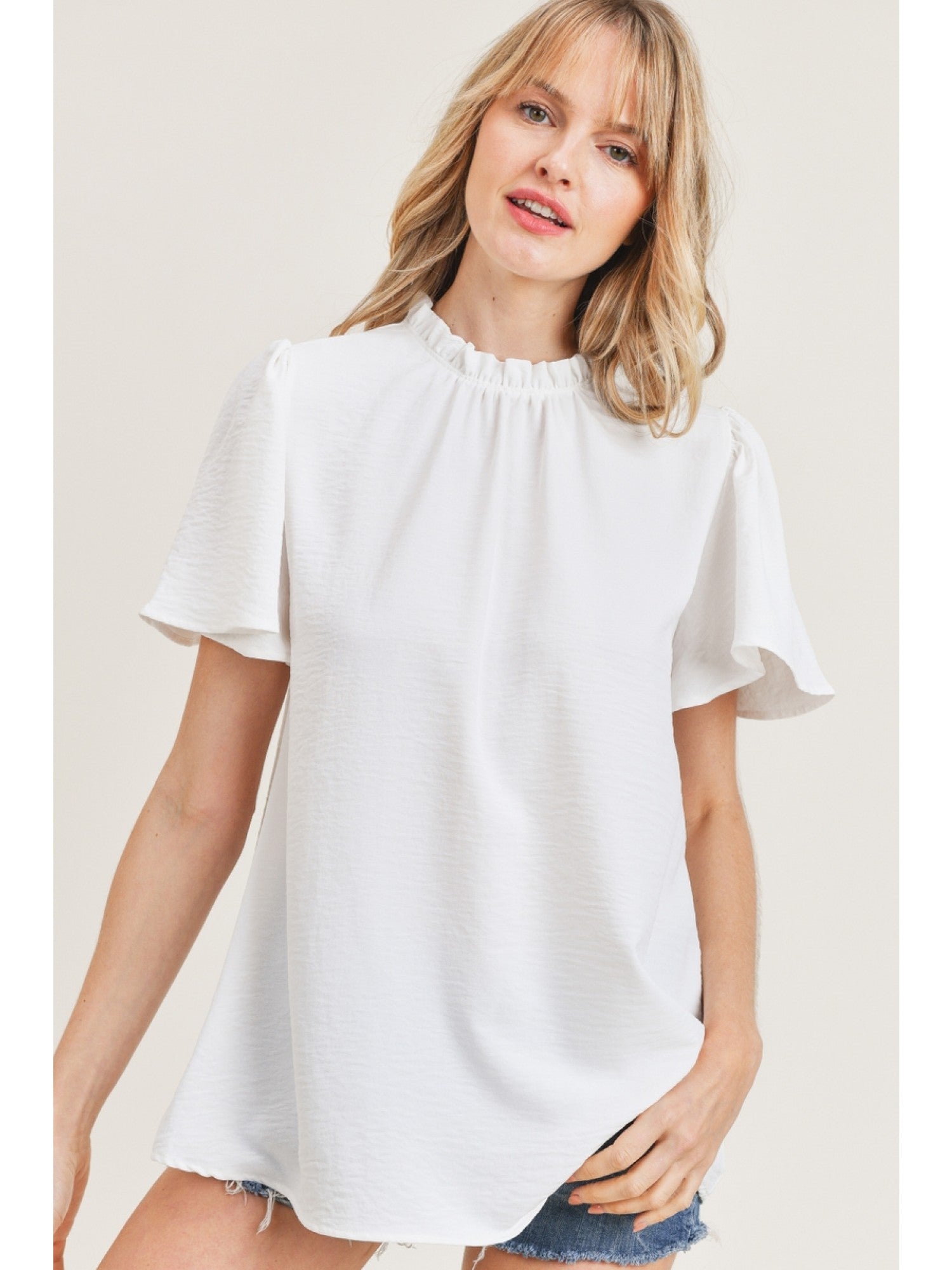 Stay on-trend with our frill neckline and short flounce sleeves that add a touch of finesse to our solid top. Our unlined and non-sheer design offer a comfortable and lightweight feel that can be worn all day. Stay stylish and sassy with our flouncy option that will have you feeling confident and fabulous.