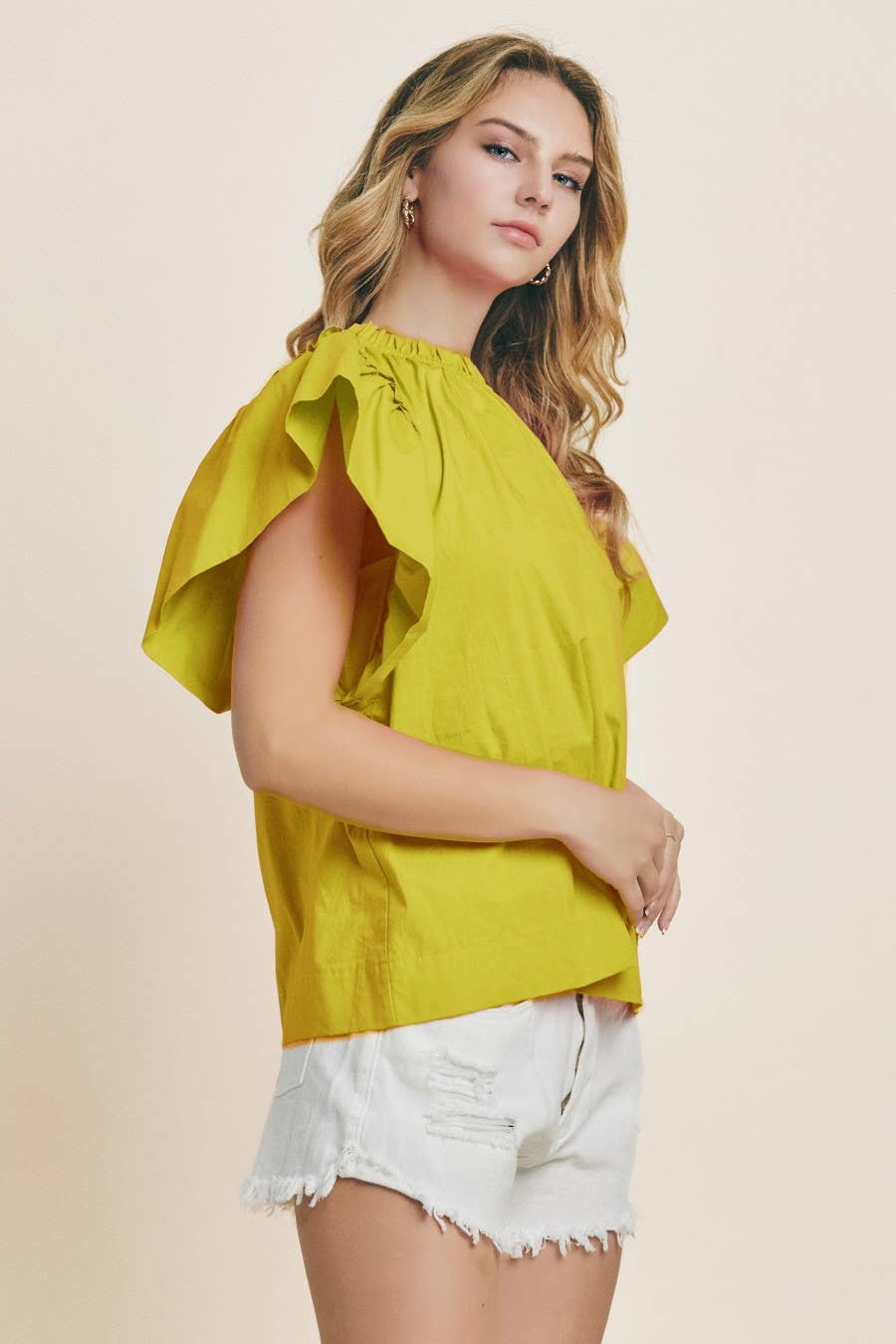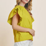 Solid poplin blouse with ruffle neck and ruffle short sleeves.
