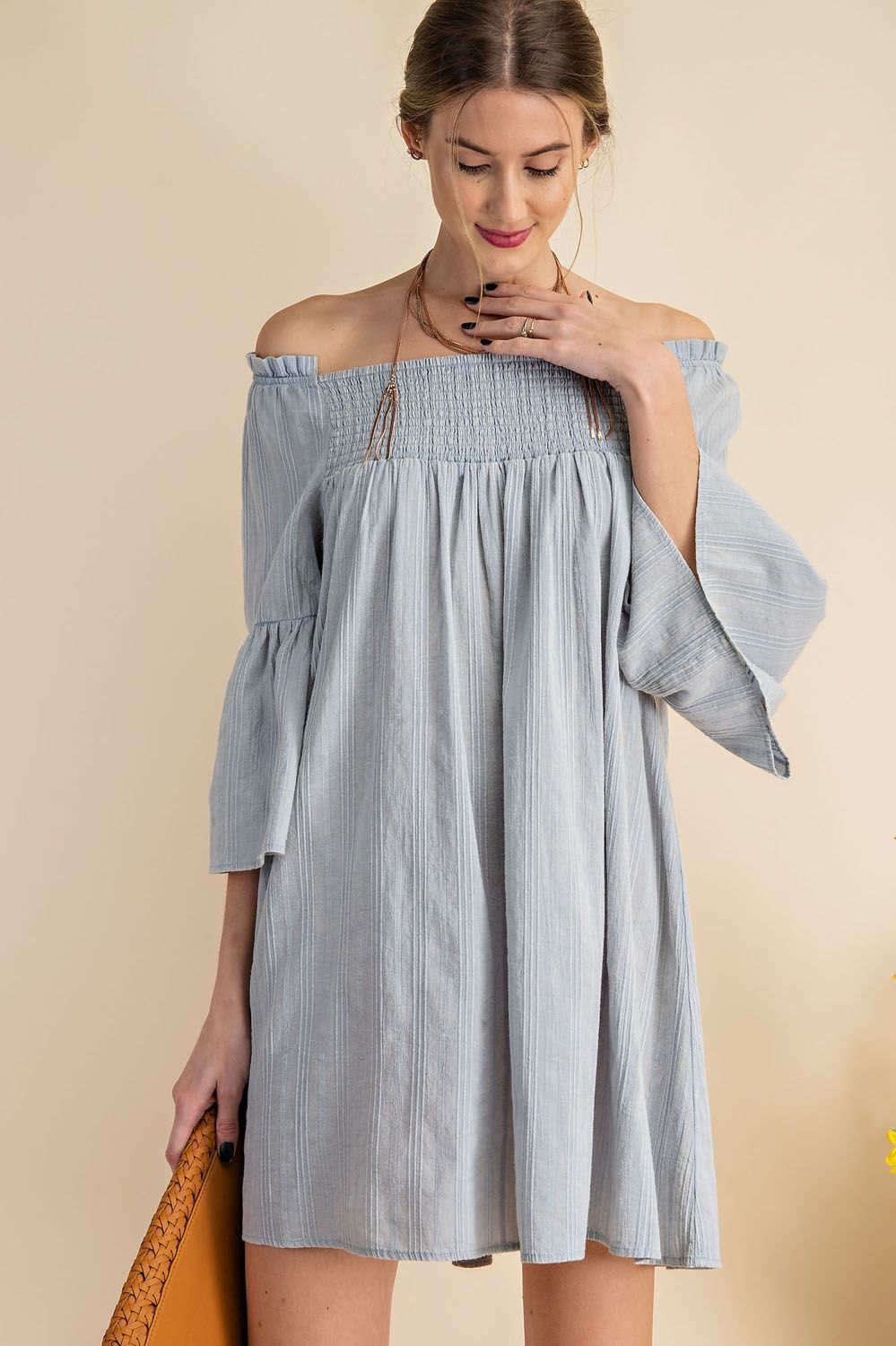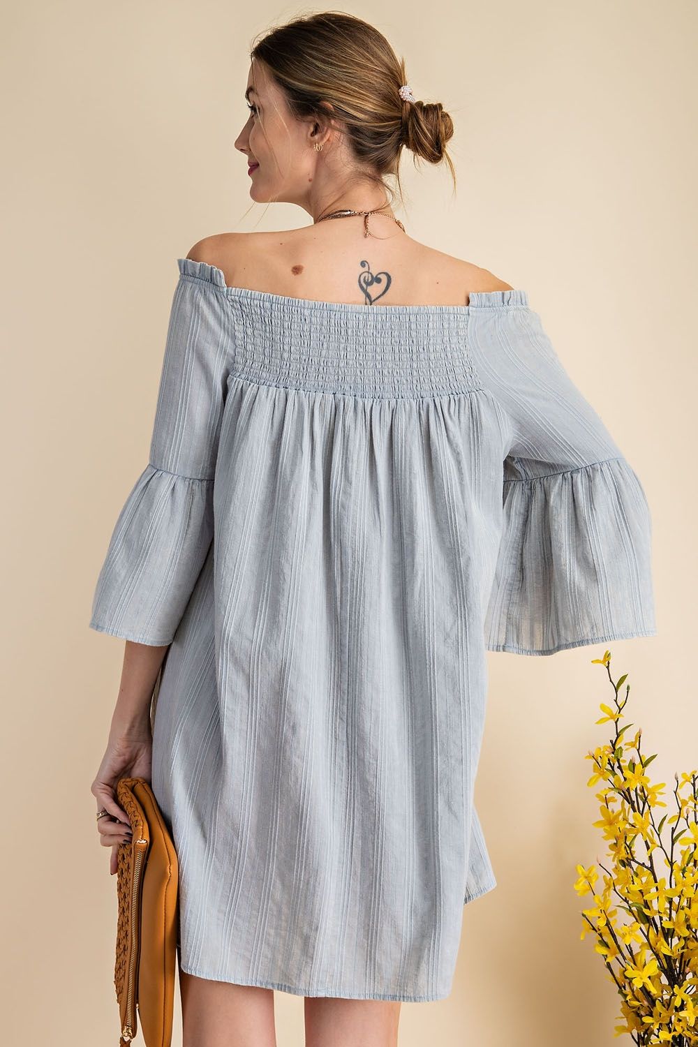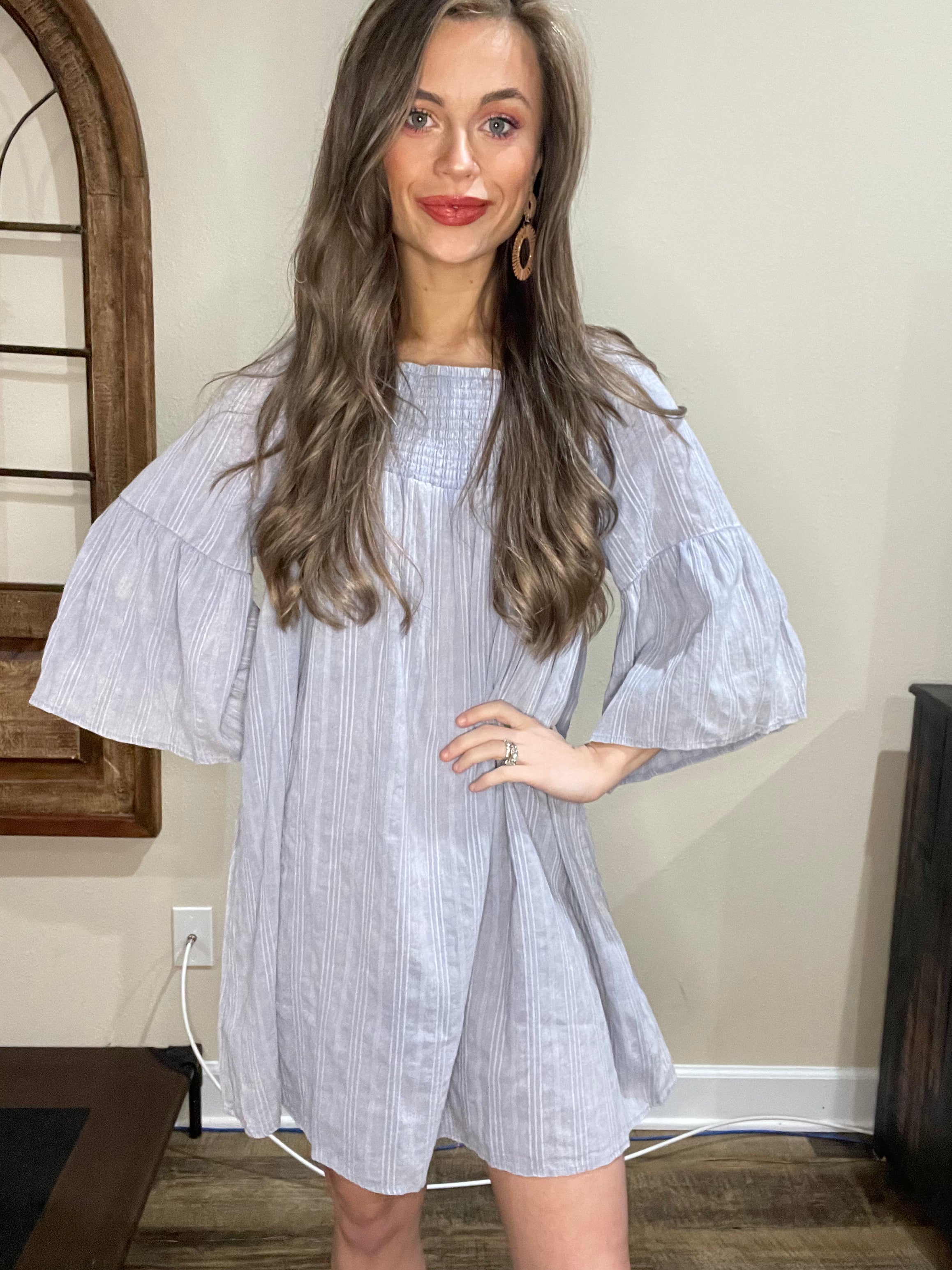 Lilac Bells Tunic- the cutest tunic with 3/4 bell sleeves, made from 100% cotton. Our off-the-shoulder smocked neckline design is a must-have for any fashionista out there! Choose from our sizes Small to Large and never worry about feeling uncomfortable.