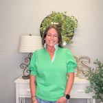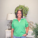 Add a fresh pop of color to your wardrobe with this bold and polished apple green top. Designed with a standout striped contrast collar and subtle puff sleeves, this elevated basic combines preppy charm with everyday comfort.