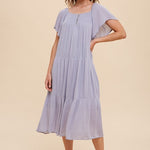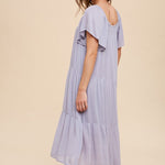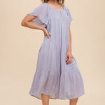 Bring a charming touch to your outfits with the Sunny Smocks Maxi dress. Crafted from soft 100% rayon, this stylish dress features an eye-catching flutter sleeve design with a tiered smock detail at the neckline. With a button front and full lining, it's perfect for any warm-weather event. Dress it up with boots or some sandals for a chic, fashion-forward look. Available in this slate color and sizes S-L.
