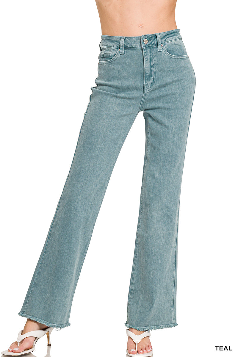 Teal Acid Wash Freyed Straight Wide Leg Pants