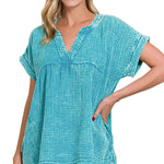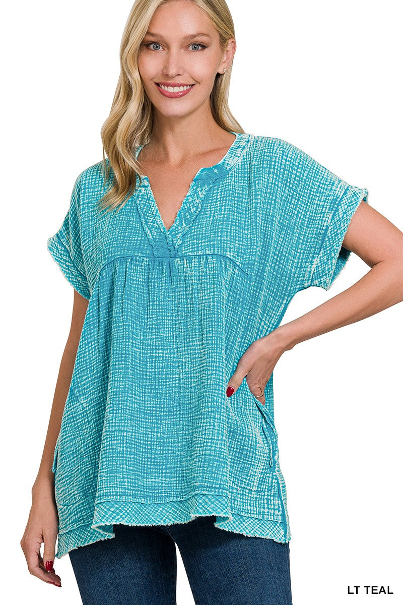 Transform your everyday wardrobe with our Teal Washed Gauze Raw Edge Top. Made from double gauze fabric, this V-neck shirt features raw edges and functional pockets, making it effortlessly stylish and practical. With a total body length of 26.5 inches and a bust measurement of 43 inches, this top is perfect for any body type. Embrace comfort and style in one!