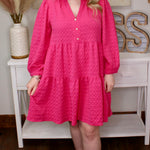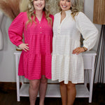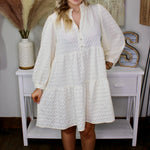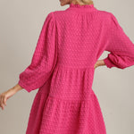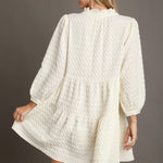 This Textured Charm Dress from Umgee is designed with elegant texture jacquard fabric and features a V-notched ruffle trim and a tiered design. Its comfortable yet stylish silhouette is sure to make it a wardrobe essential. Available in sizes Small-Large in Cream and Pink.